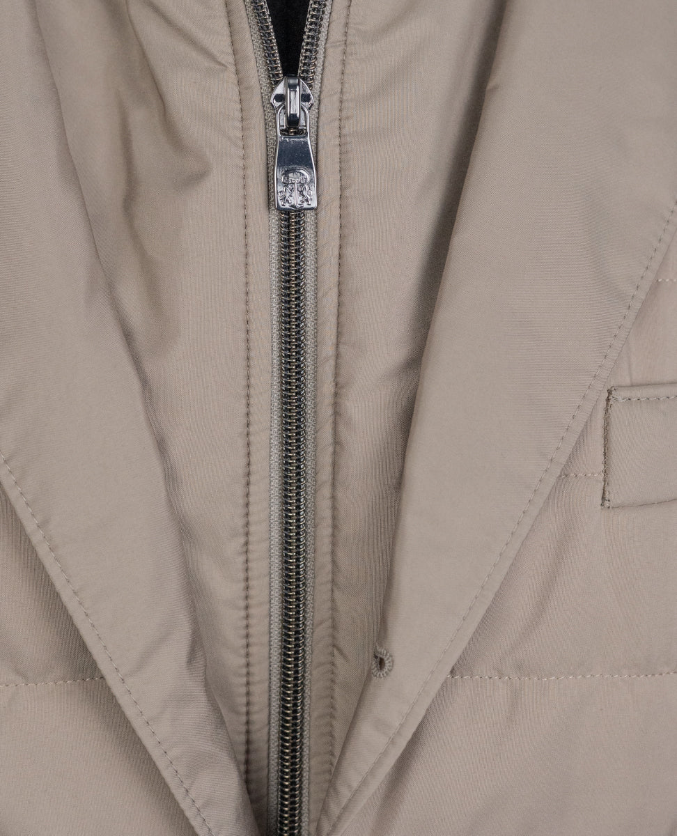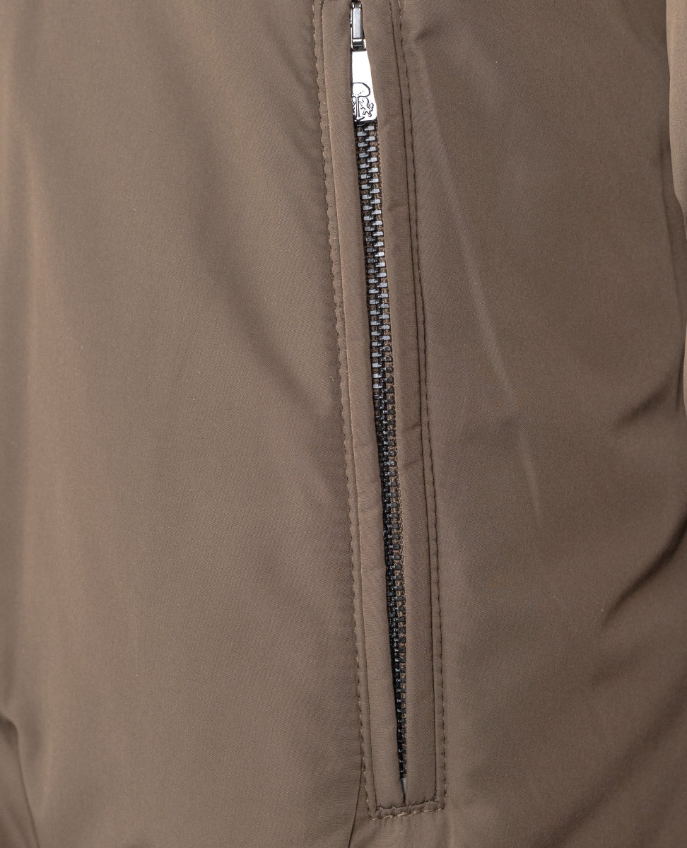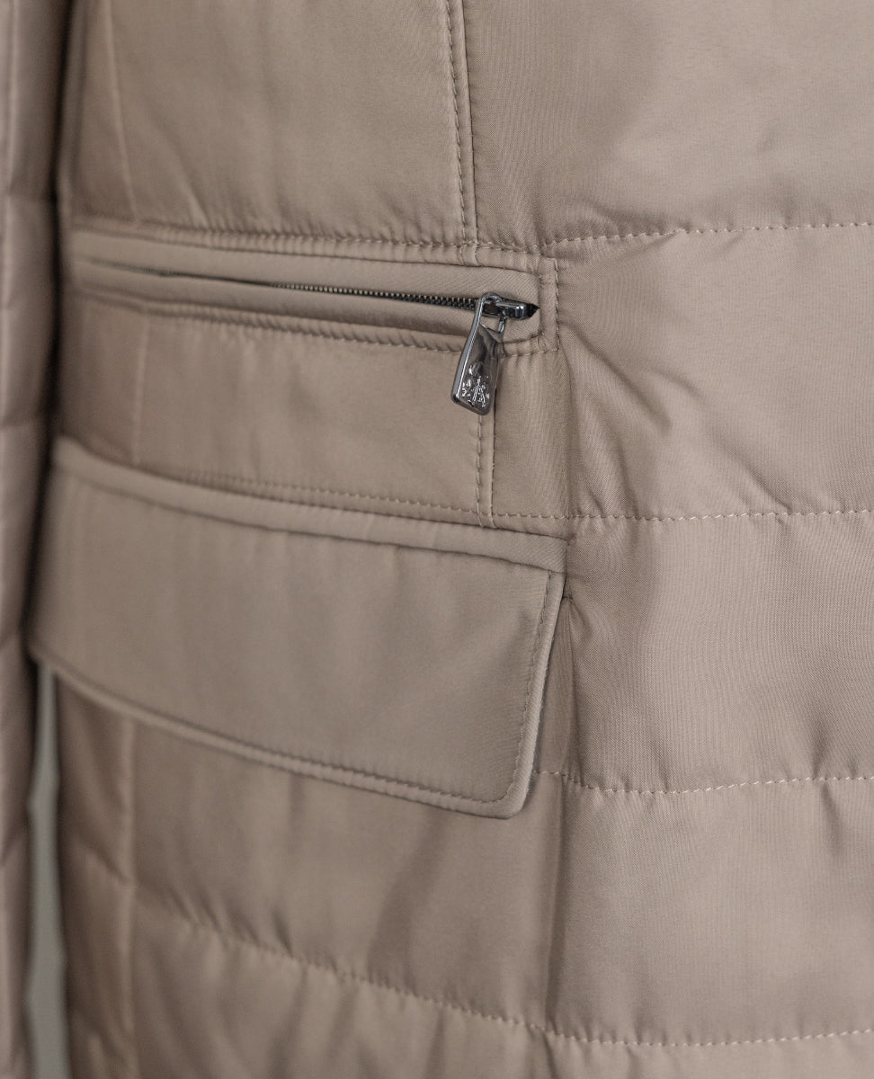 The eco-suede trims on pockets, neckline and armhole add a contemporary touch, while the eco-suede lining with multiple pockets and dual cursor zip closure are super practical. Made in Italy with 65 cm length and drop 7 size, this gilet is the perfect garment for facing the fresher days with class.