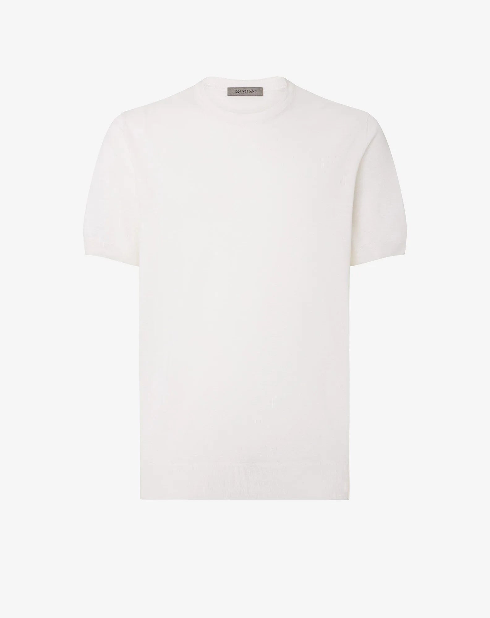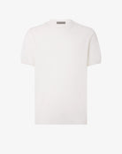 Made from a blend of fine silk and linen, the classic short-sleeved crew neck jumper in white is an essential of the Men's wardrobe for the Spring-Summer season.