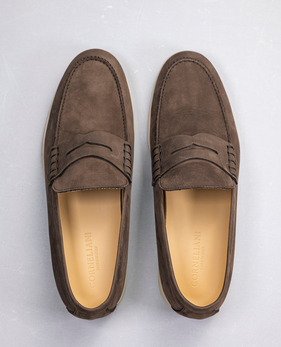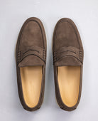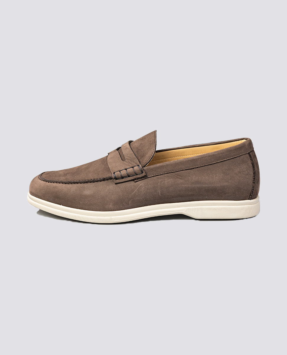 Calf suede slip-on style almond toe flat rubber sole branded insole.