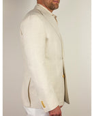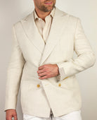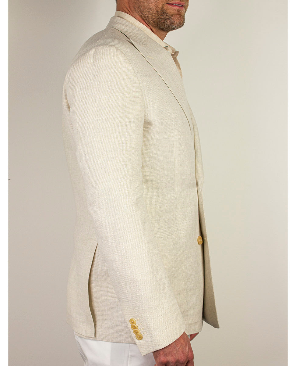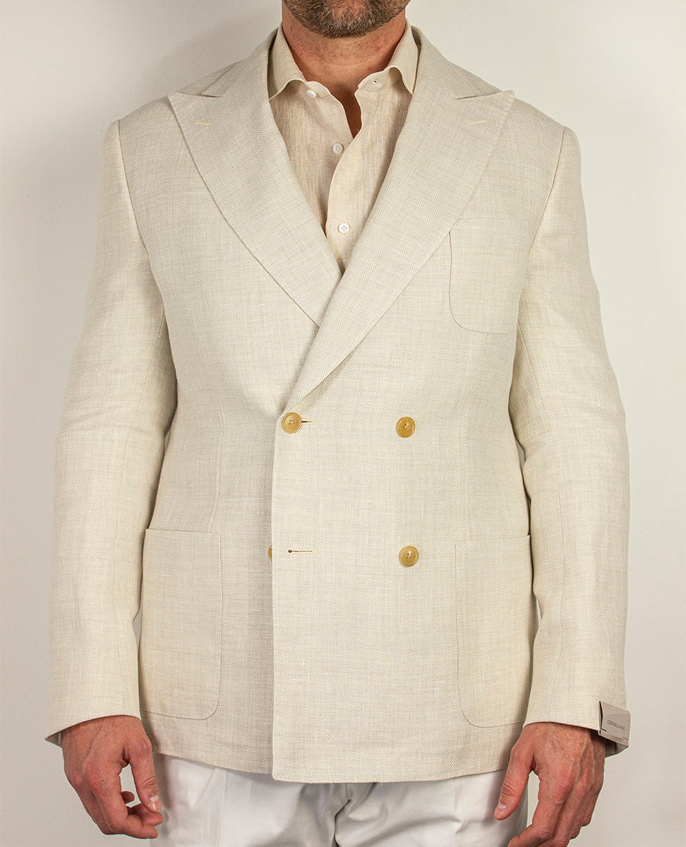 The unlined, double-breasted six-button hopsack Men's jacket has a slim fit, patch pockets and side vents at the back for greater ease of movement. Sartorial details such as the AMF stitching at the edge and the real horn buttons enhance the elegance of the garment without altering its casual style. Hopsack wool is characterized by a wider, more open weave, which makes this fabric extremely light, breathable and perfect for unlined jackets in the spring or summer season.
