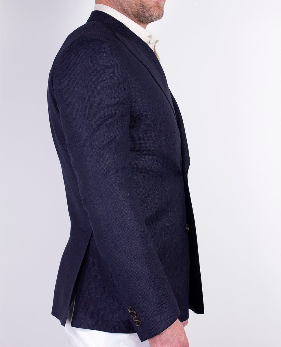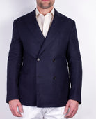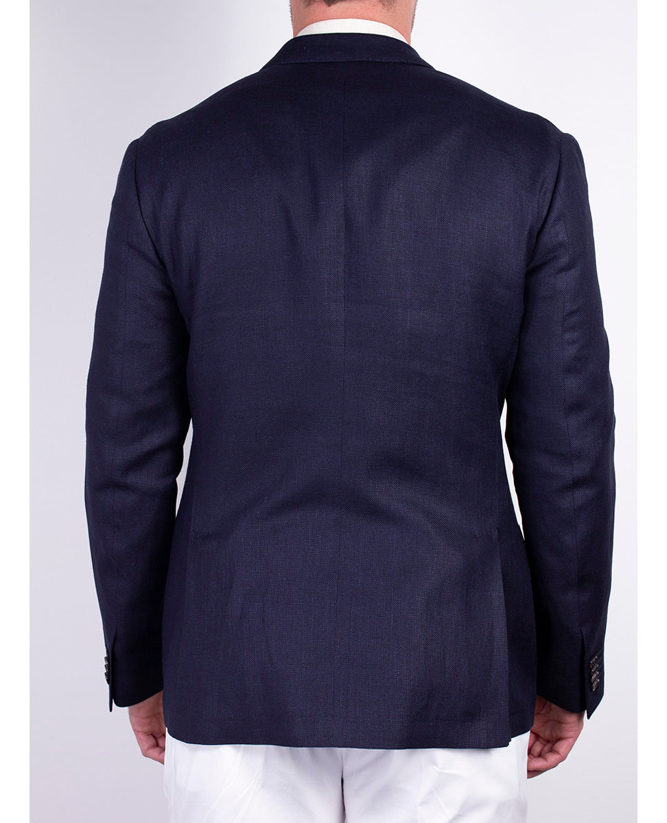 The unlined, double-breasted six-button hopsack Men's jacket has a slim fit, patch pockets and side vents at the back for greater ease of movement. Sartorial details such as the AMF stitching at the edge and the real horn buttons enhance the elegance of the garment without altering its casual style. Hopsack wool is characterized by a wider, more open weave, which makes this fabric extremely light, breathable and perfect for unlined jackets in the spring or summer season