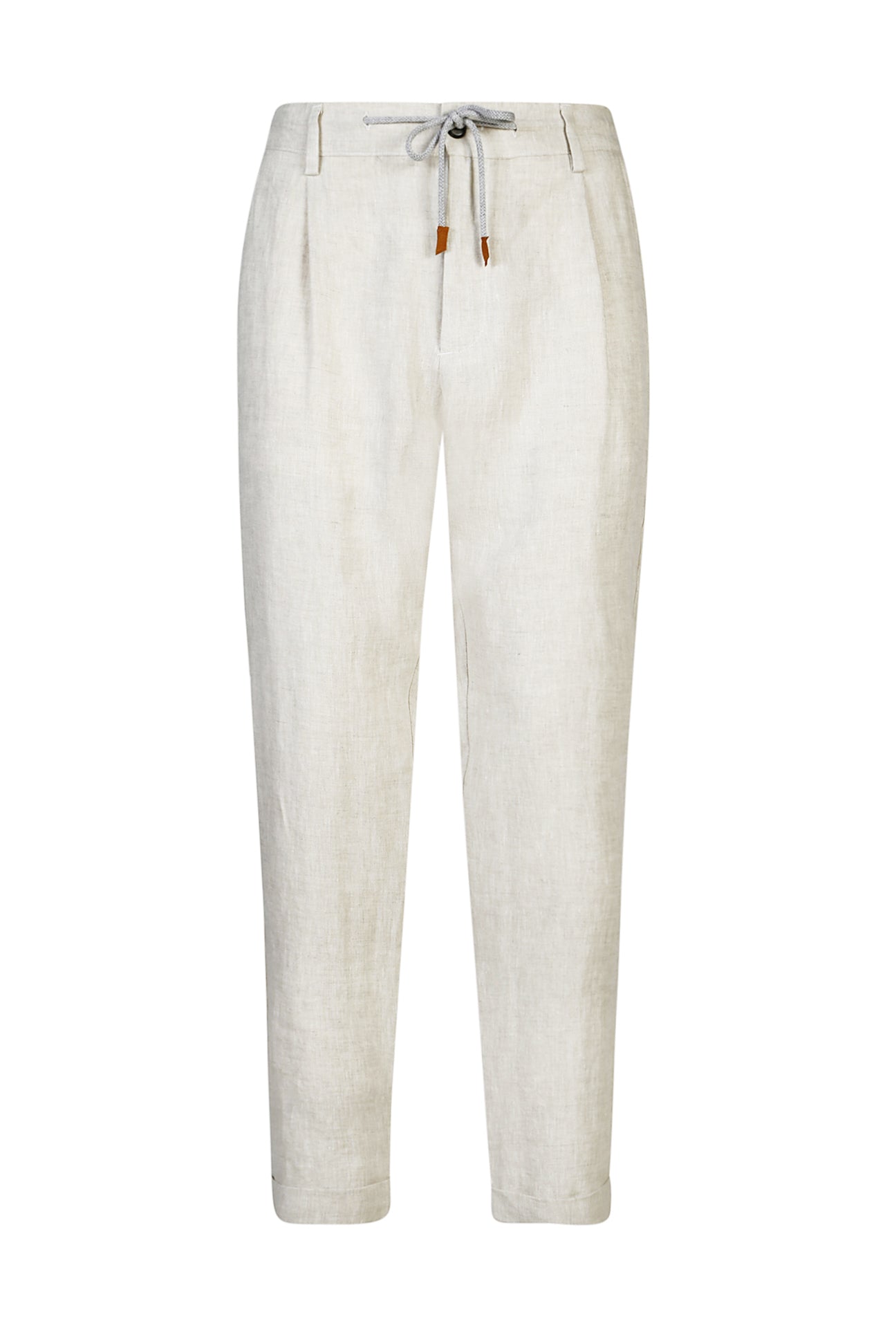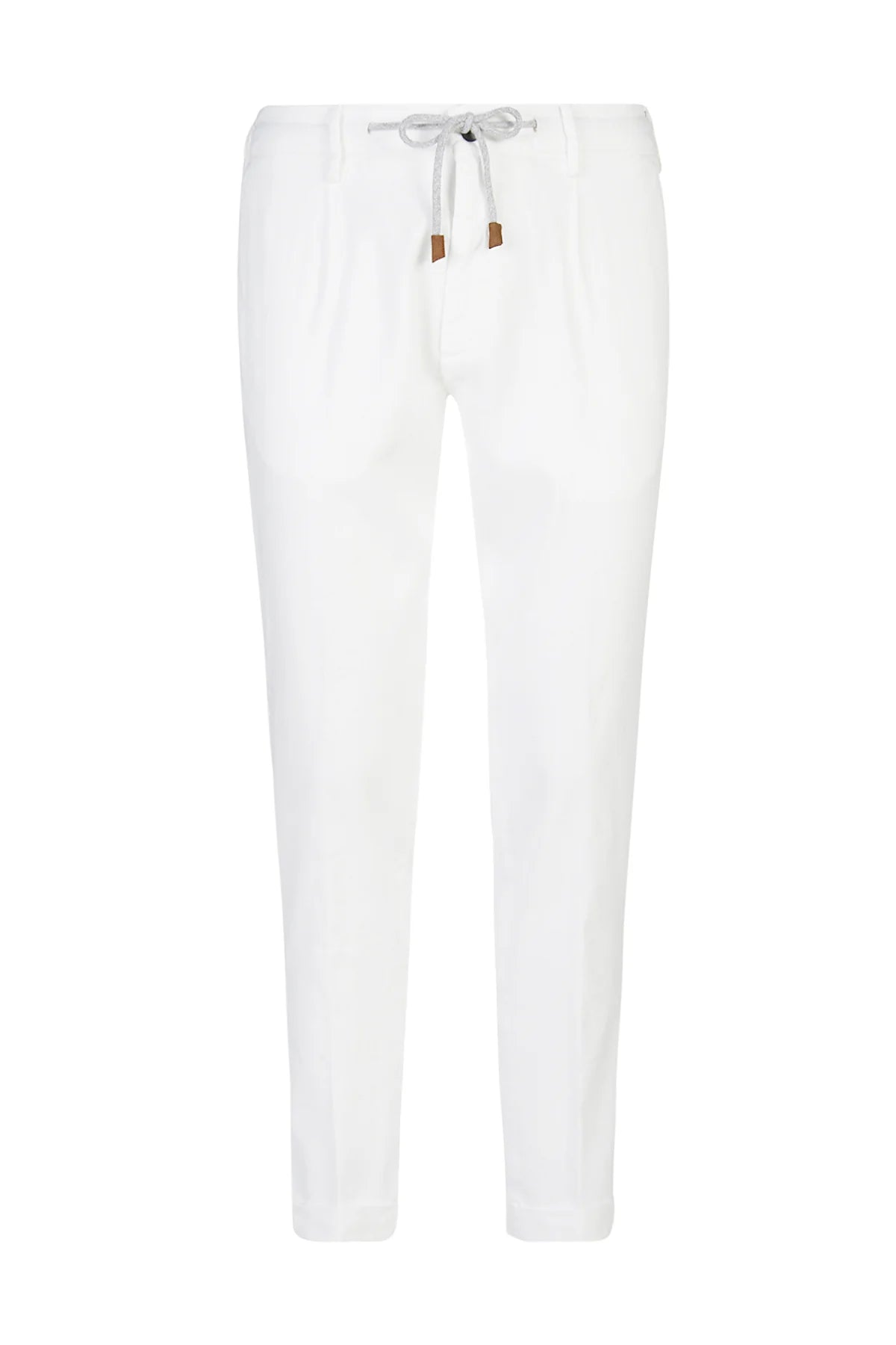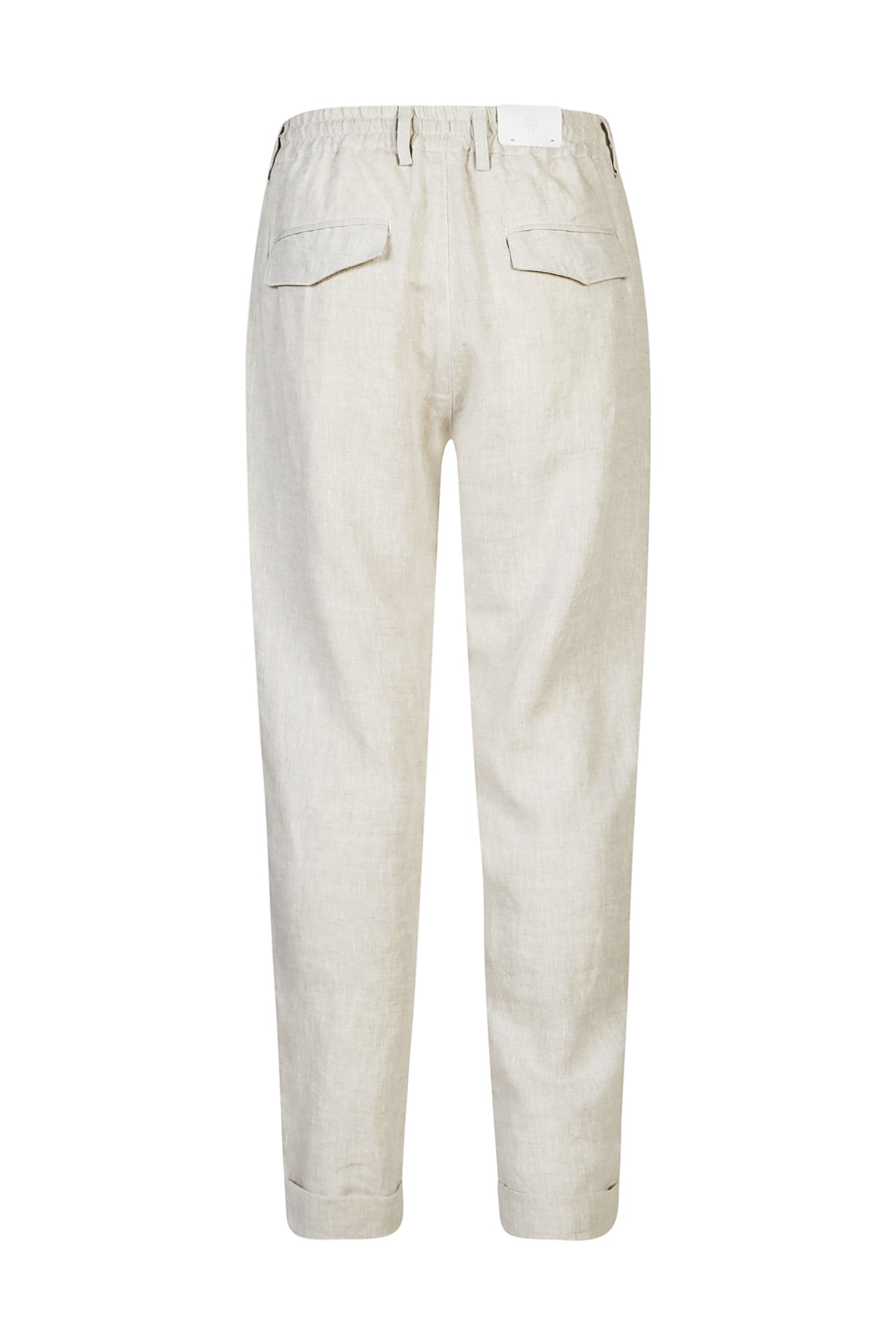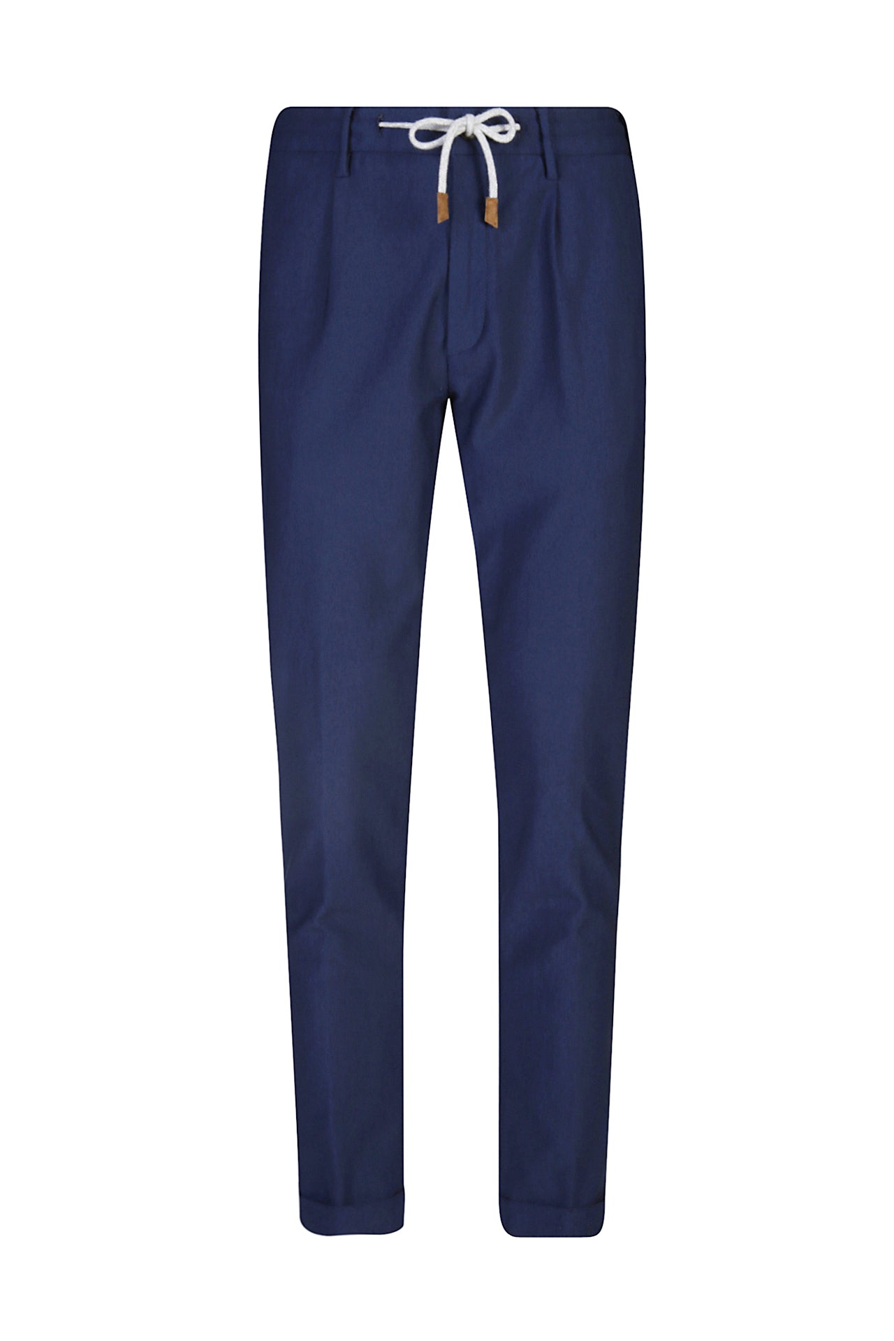 The jogger pant model with drawstring and shaped suede hem is made of cotton and tencel, a particular fiber that allows the body to ensure a constant temperature. The presence of silk embellishes the fabric. The old treatment accentuates color nuances near the seams, giving it a worn look. The belt loops are handmade and inserted into the belt, waistband and pad with tailored construction, internal crotch, tailored jump stitch on the placket (front pockets and rear pocket flaps) and coin pocket positioned internally in the right pocket.