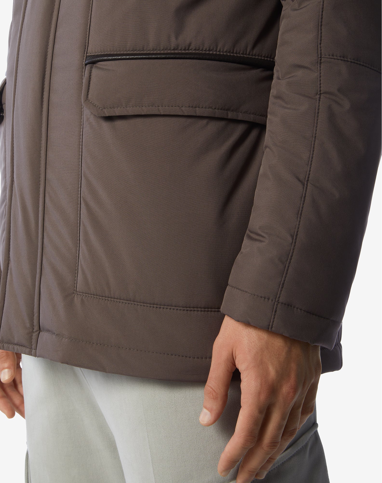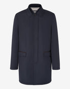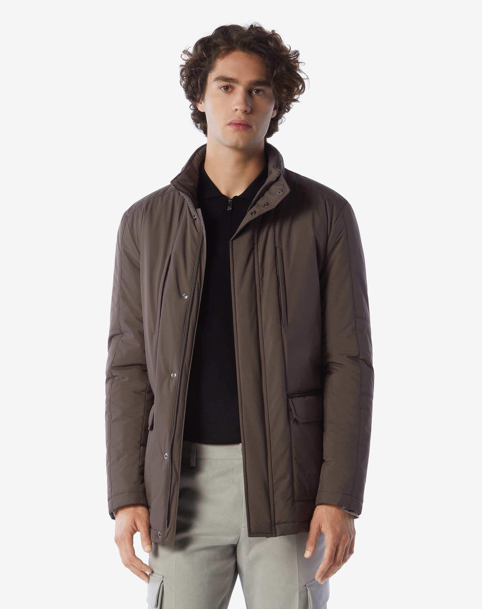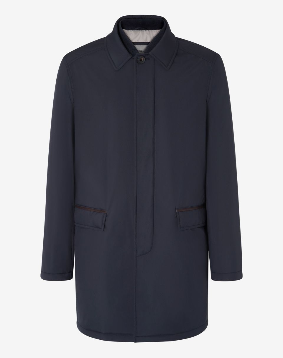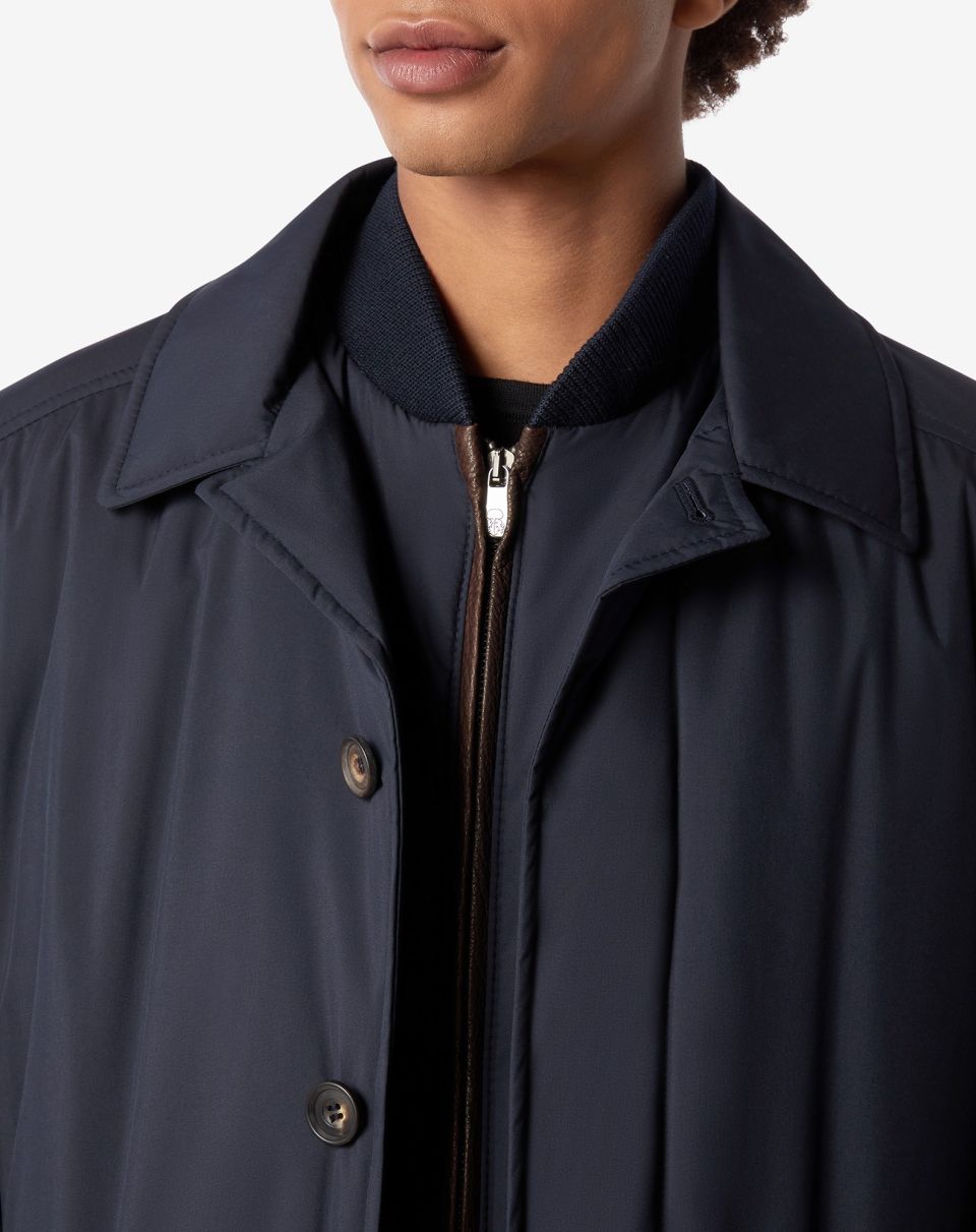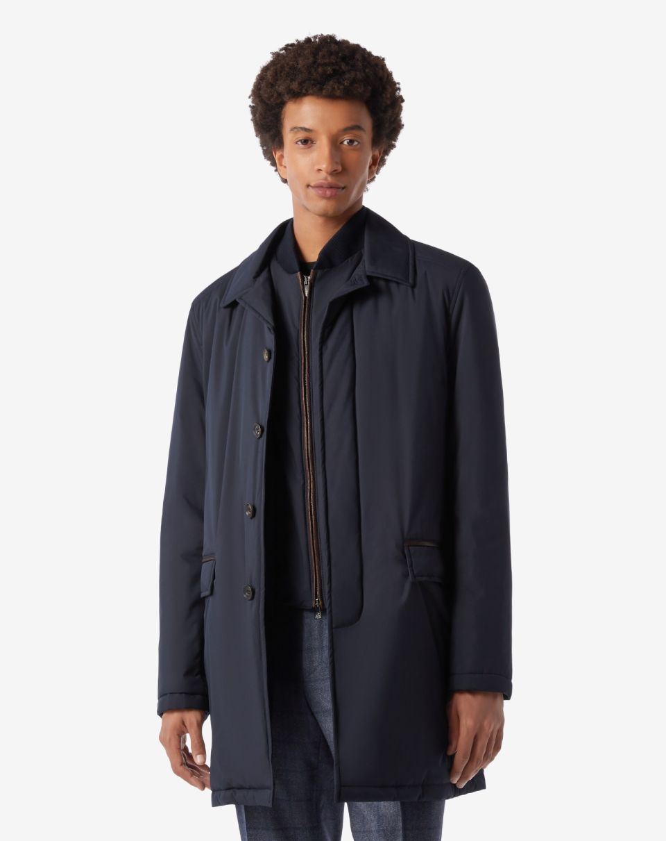 The technical poplin men's raincoat with wadding is a must-have autumn garment: lightweight and rich with sophisticated details, it is the ultimate in minimalist elegance. The (non-detachable) inner vest features a knit neckline. The hidden 4-hole buttons and the large pockets underline the garment's clean design, while the leather details add personality.