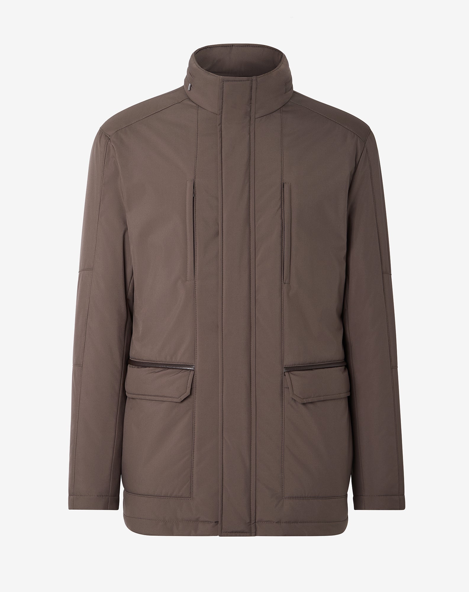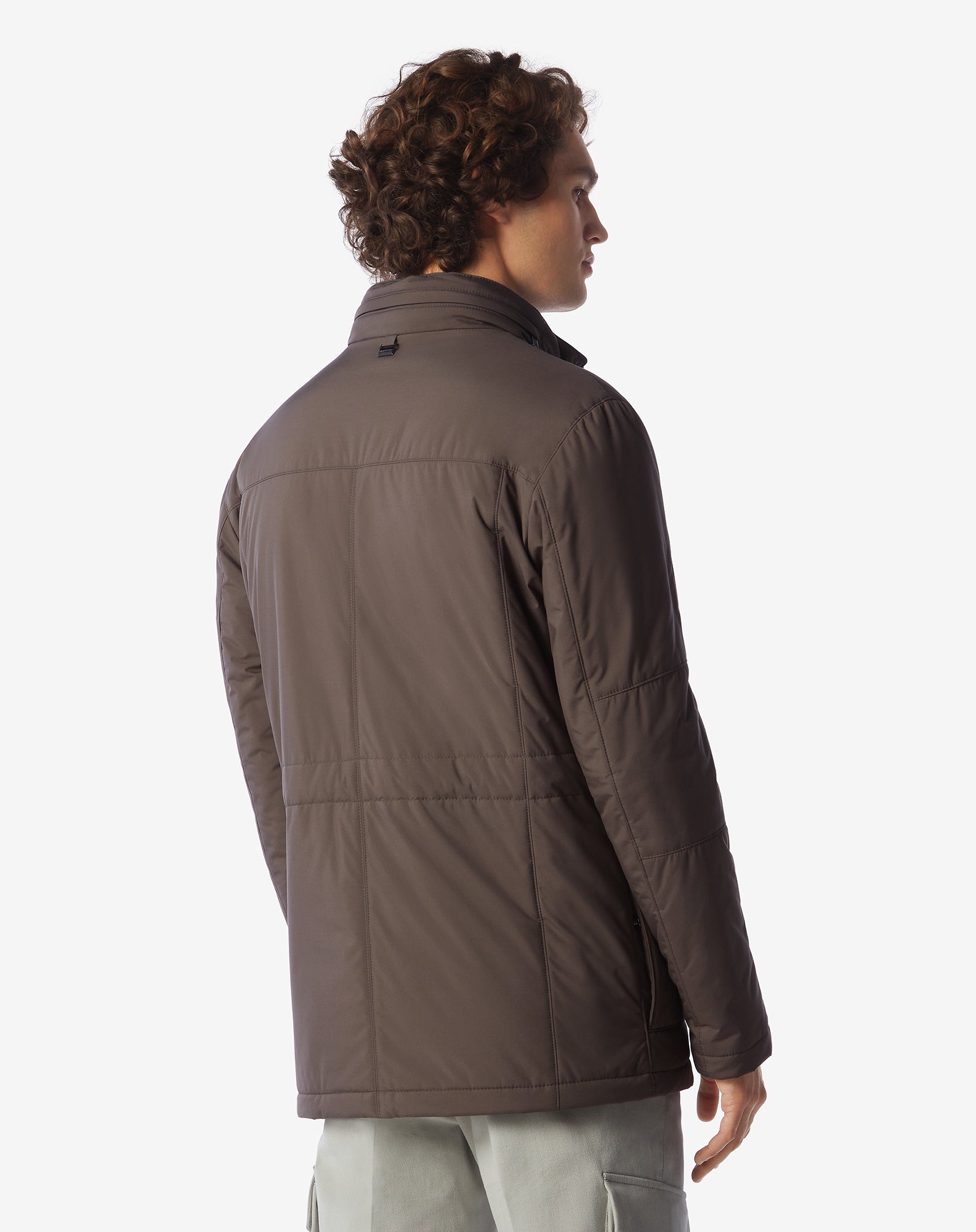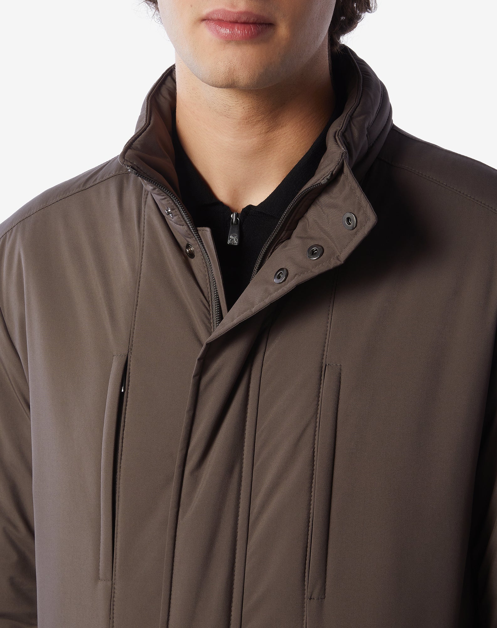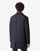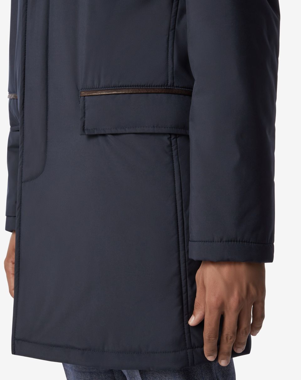The technical poplin men's raincoat with wadding is a must-have autumn garment: lightweight and rich with sophisticated details, it is the ultimate in minimalist elegance. The (non-detachable) inner vest features a knit neckline. The hidden 4-hole buttons and the large pockets underline the garment's clean design, while the leather details add personality.