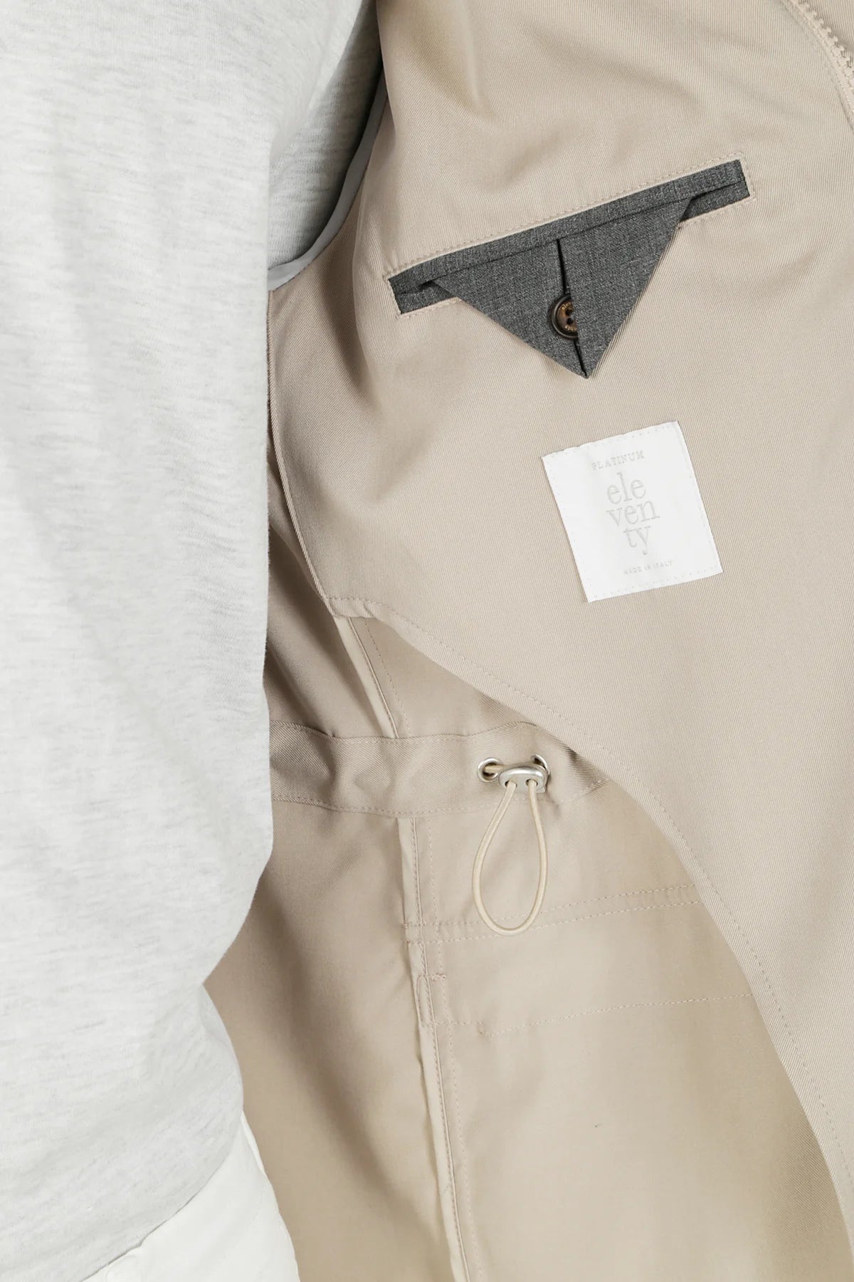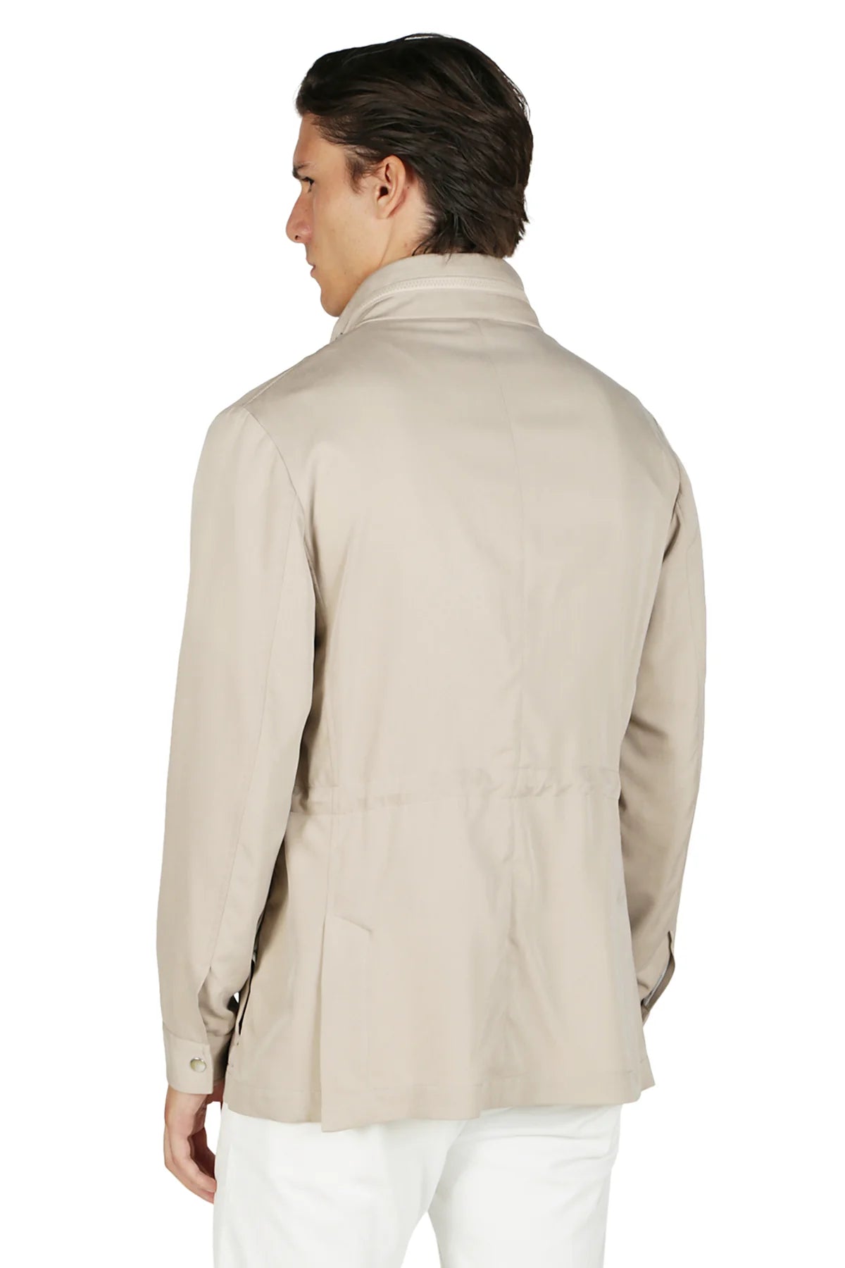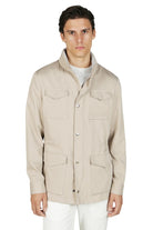The field jacket model is made of 100% Linen by Ermenegildo Zegna. The presence of this precious and natural fiber gives the product a velvety and pleasant touch, which stands out for its beauty and lightness. Thanks to the technical treatment with Teflon, the fabric is protected from water drops, making it always dry and water-repellent. The presence of patch and pocket pockets contribute to making the garment functional and practical. The details of the logoed nickel-free snap buttons and the die-cast zip give the product that sporty-chic taste, typical of the brand. The detail of the melange gray rib positioned on the inside of the neck embellishes the outerwear, underlining the care that Eleventy places in every single aspect