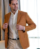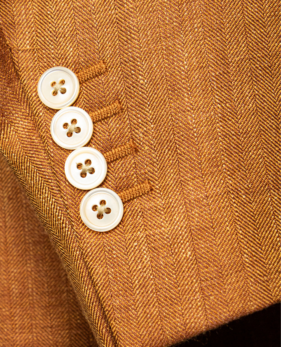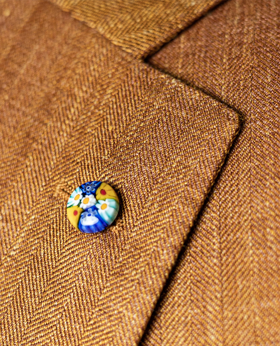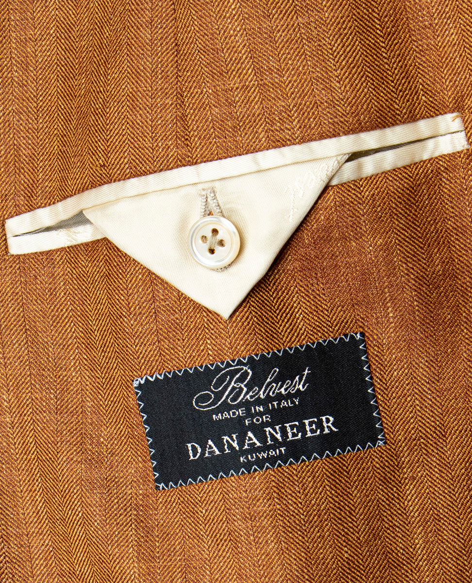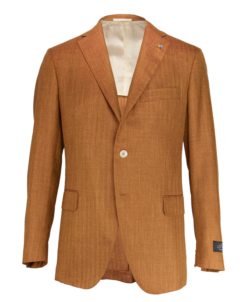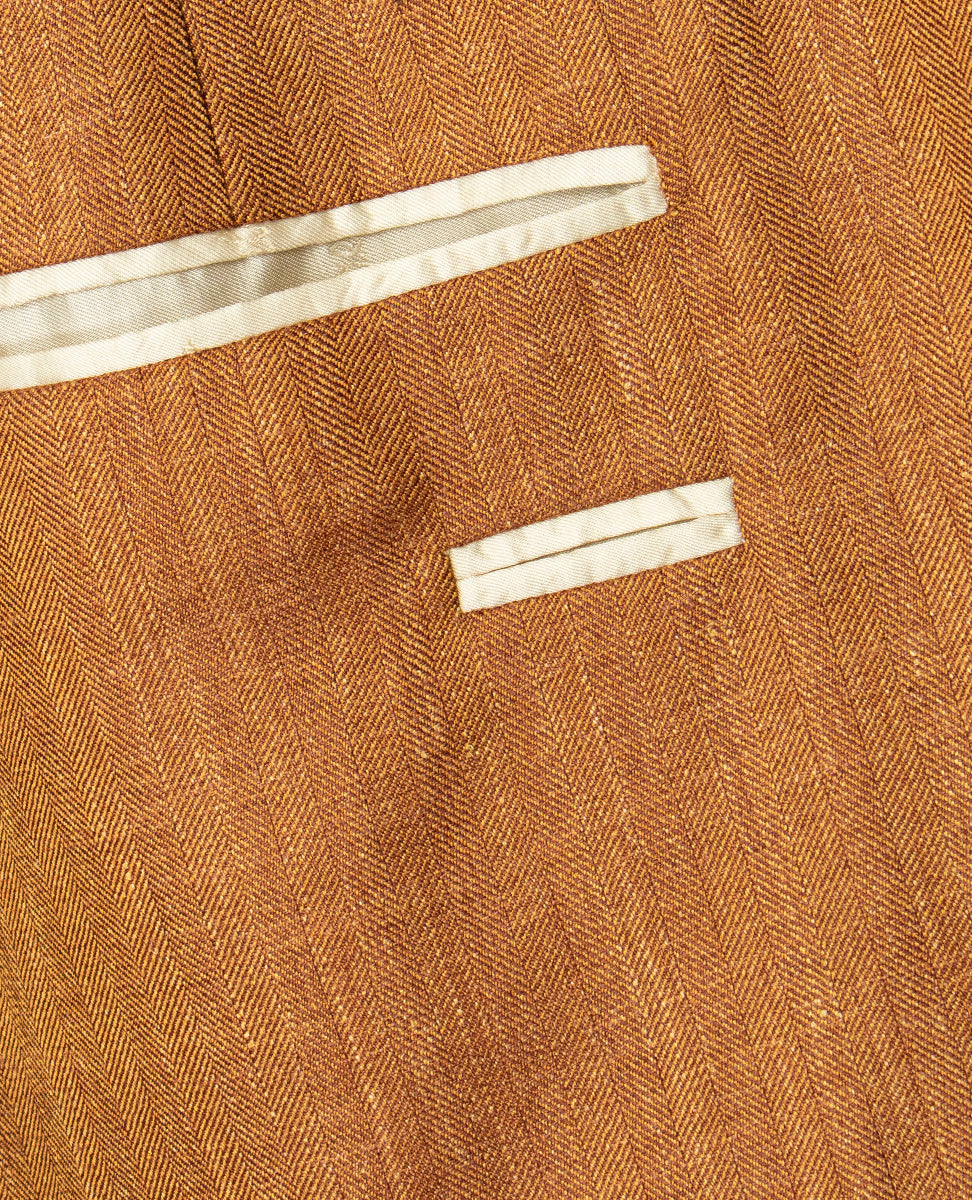 This blazer highlights Belvest's rich history of developing cutting-edge designs and fabrics. The intricate three-dimensionality in Copper brown colour highlights the sophisticated chromatic contrast created by the chalk-coloured silk and linen fibre.