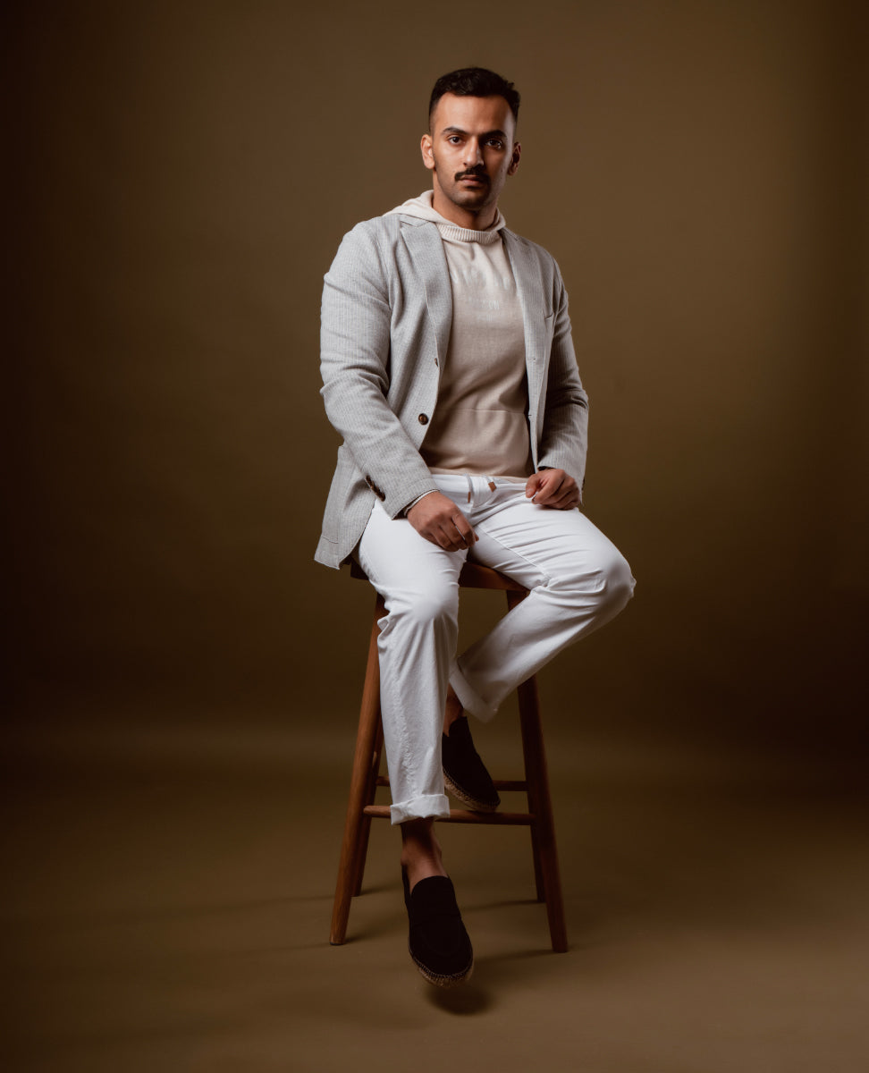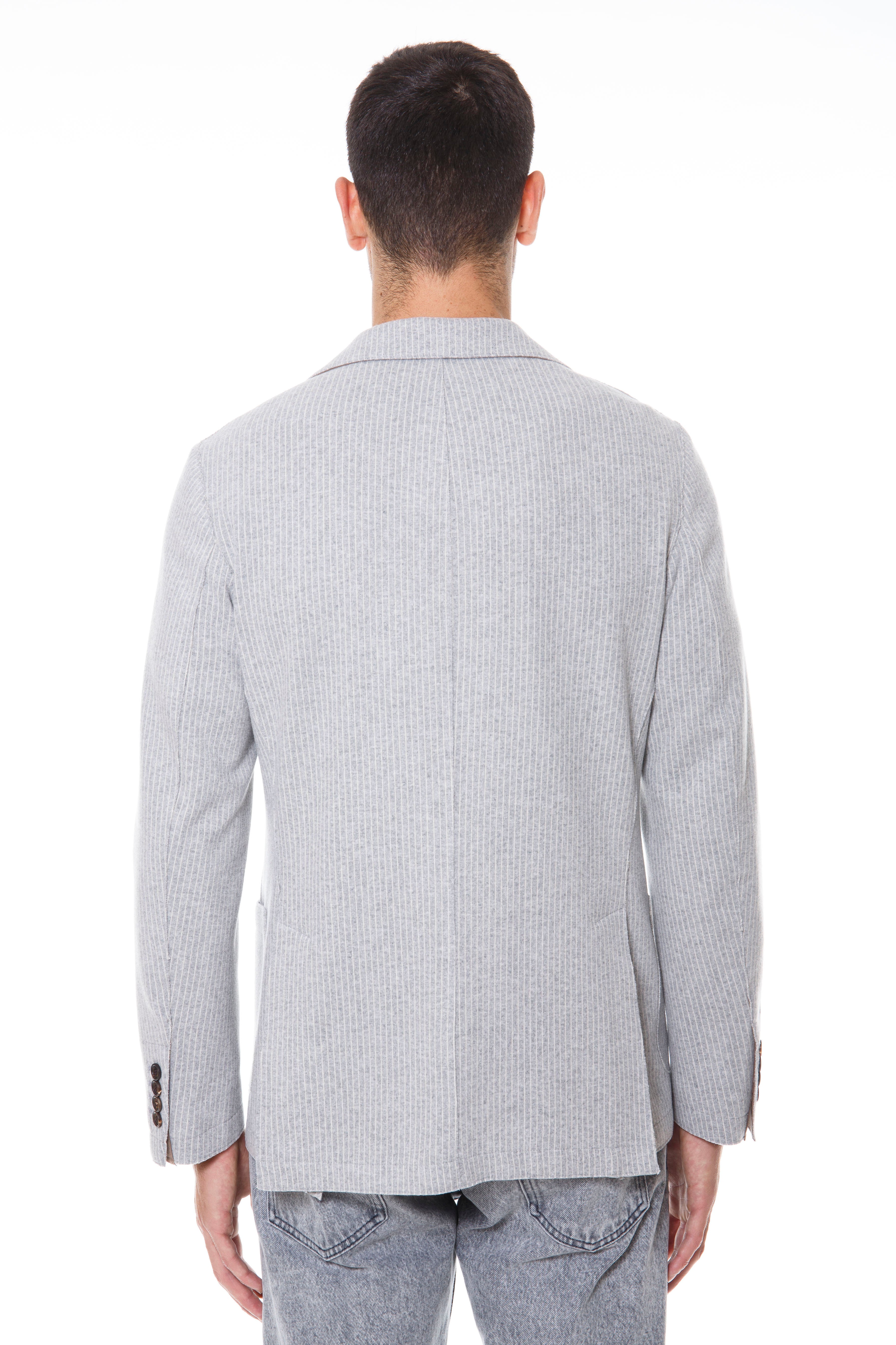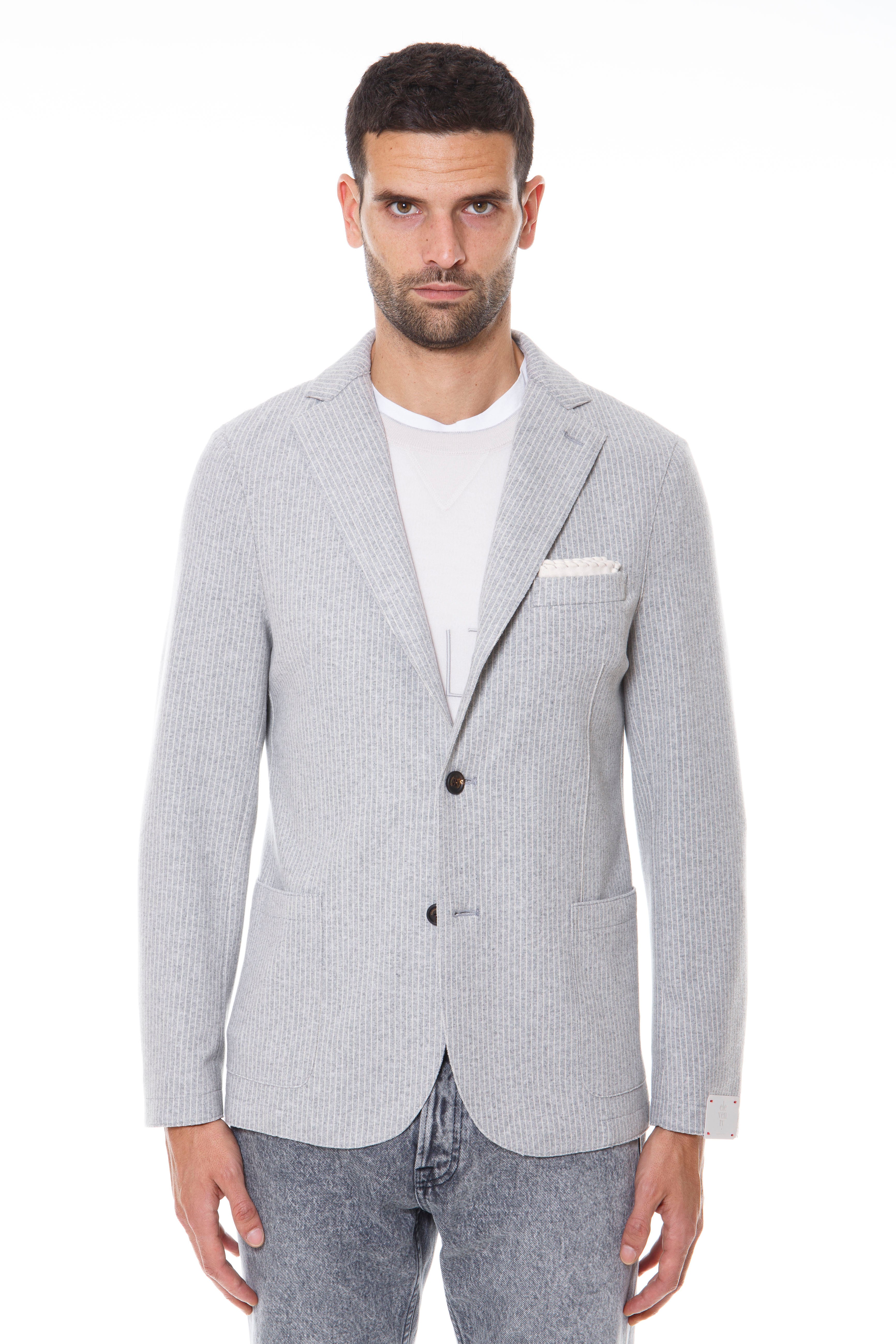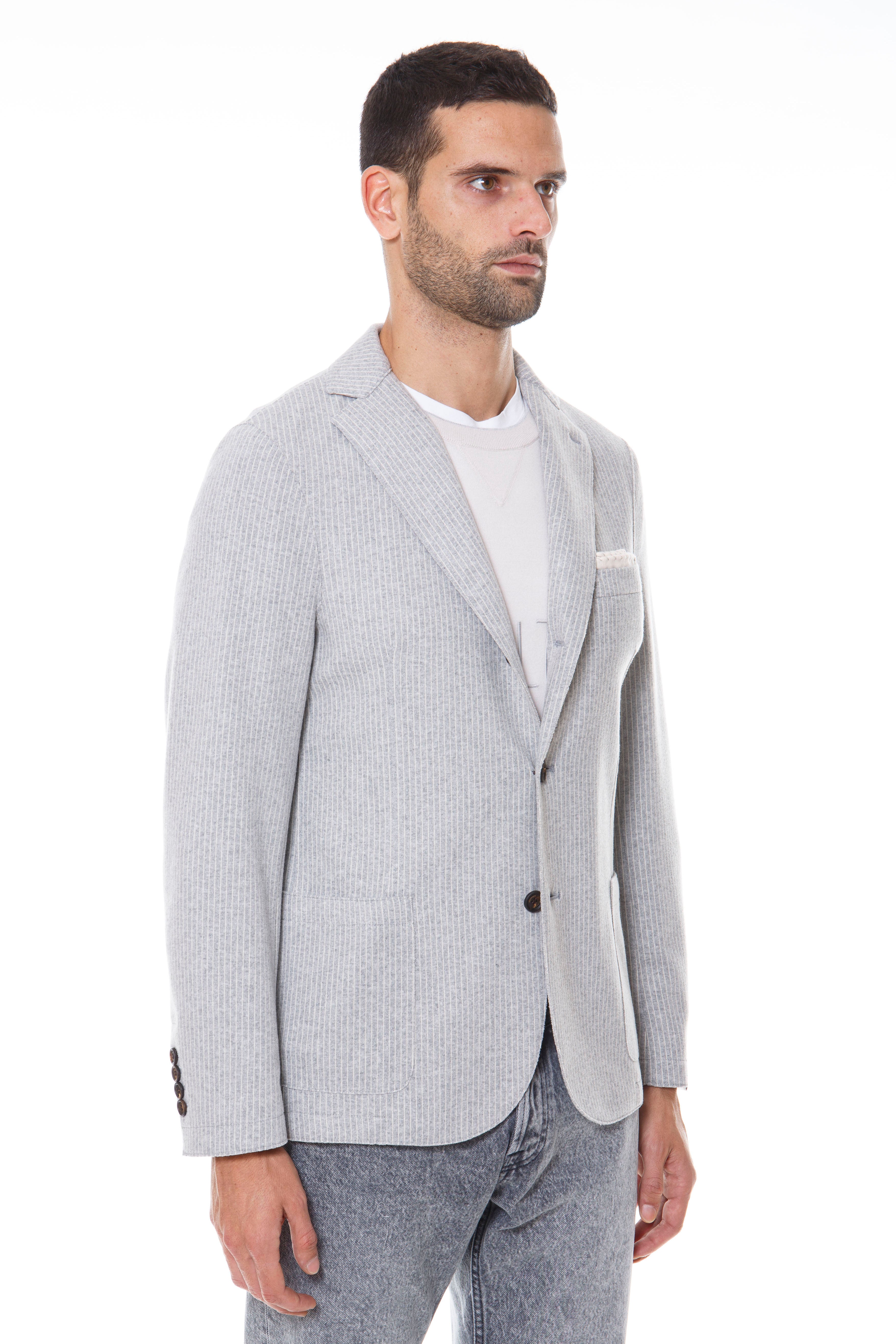 The three-buttoned, ironed 2 raw-cut jacket in polyester and viscose with a pinstripe pattern is Eleventy's iconic piece and is embellished with alcantara details that make it unique and special. The raw-cut construction makes the jacket lightweight and the high level of comfort provides a fit that adapts to any body type, with the sensation of wearing a sweater while preserving the impeccable appearance of the jacket.
