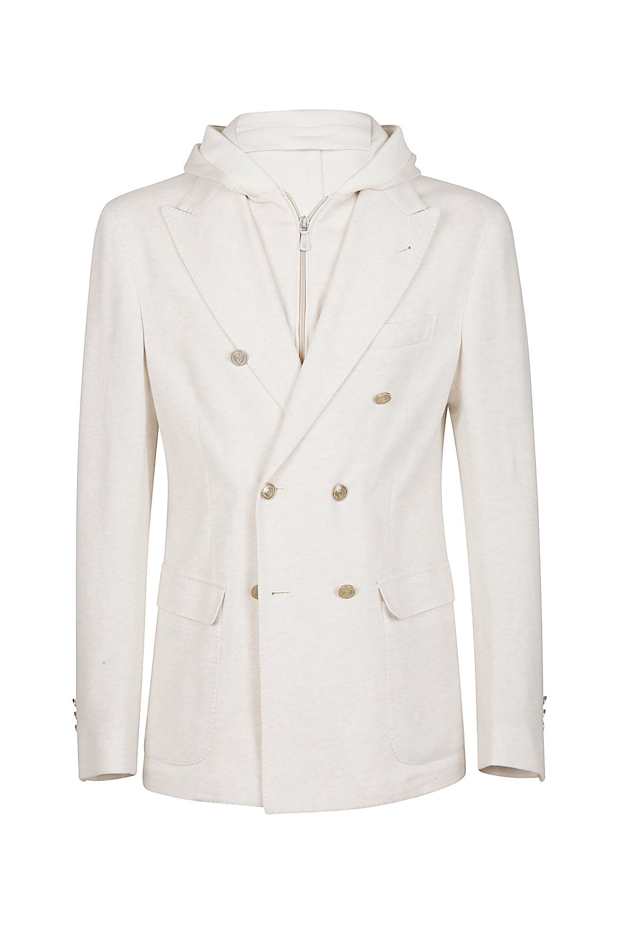 The four -mounted double -breasted jacket model with bib is made of cotton and cashmere jersey. The presence of cashmere embellishes the tissue, and the natural elasticity of the jersey gives comfort and ease to the wearer. The detail of the removable chest, in the same fabric of the jacket, enhances its versatility, allowing its use for both formal occasions and leisure. The detail of the shirt tipping in Costa along the outside of the hood highlights the care that Eleventy It puts in every choice, giving it a sport-chic taste. Loggato accessories complete the corporate.