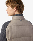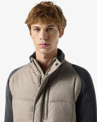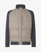 Beige technical stretch cashmere bomber jacket, the perfect blend between technology and the quality of fine fibres. Real down padding in the quilted body ensures warmth and lightness, enhanced by the comfort of the knitted sleeves, neckline and hem. The suede details on the pockets add a sophisticated touch, while the dual cursor zip closure and concealed snap buttons create a versatile, clean style. Made in Italy within the Microcashmere Project, blending the soft warmth of cashmere with the durability of polyamide, it offers unique performance and water resistance.