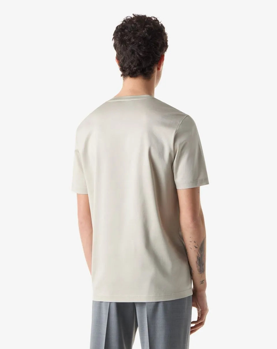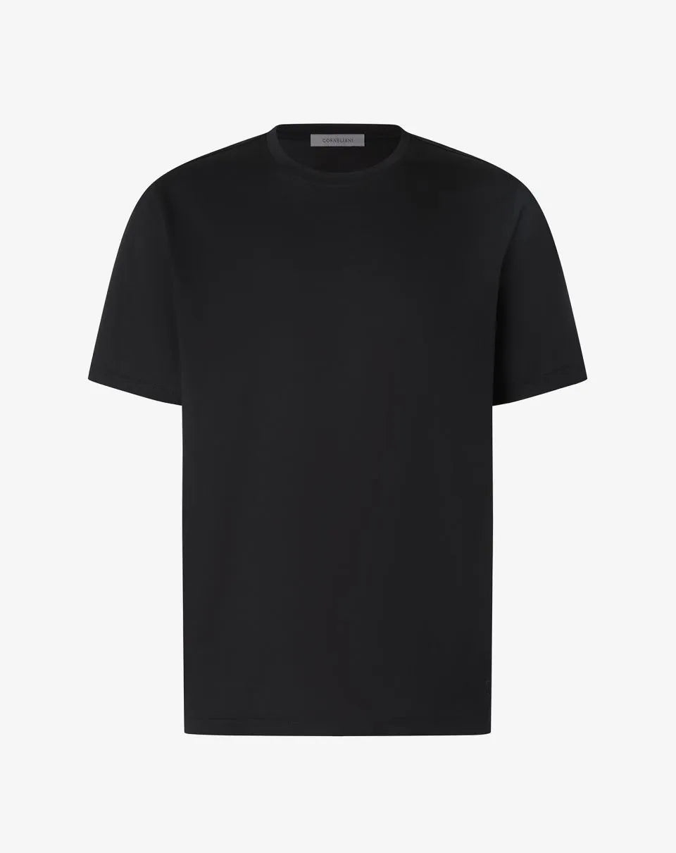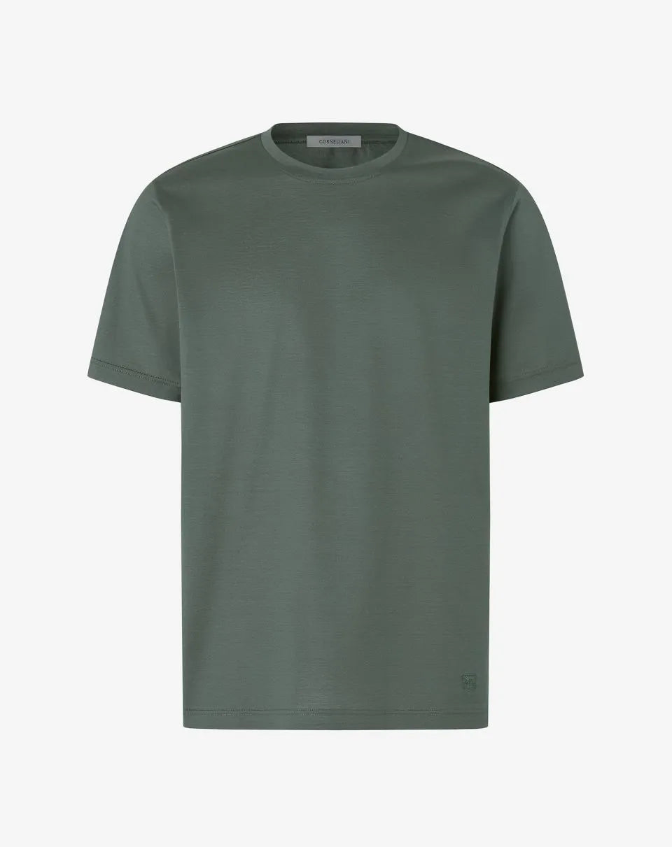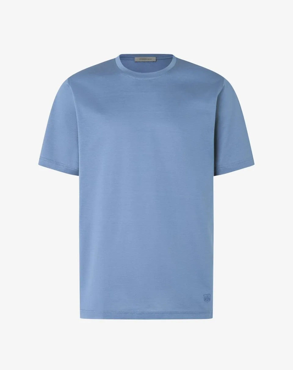 Made in Italy from shiny plain knit lisle, this pure cotton crew-neck T-shirt is a men's wardrobe essential. The short-sleeved construction and clean design enhance its versatile attitude, while the Corneliani crest on the side adds a distinctive and discreet detail.