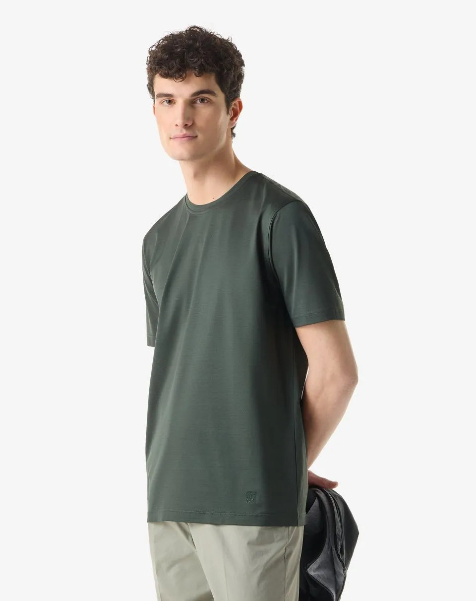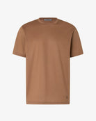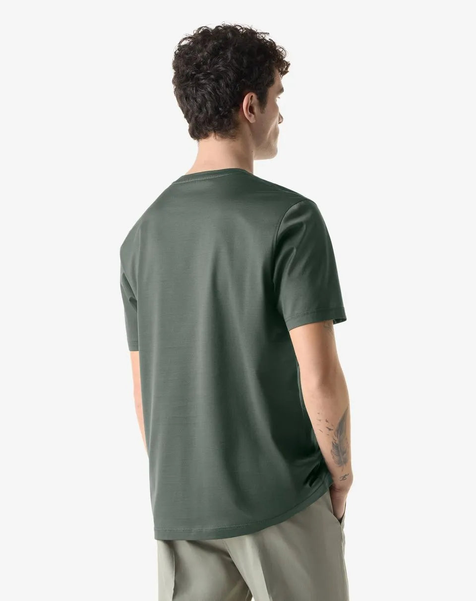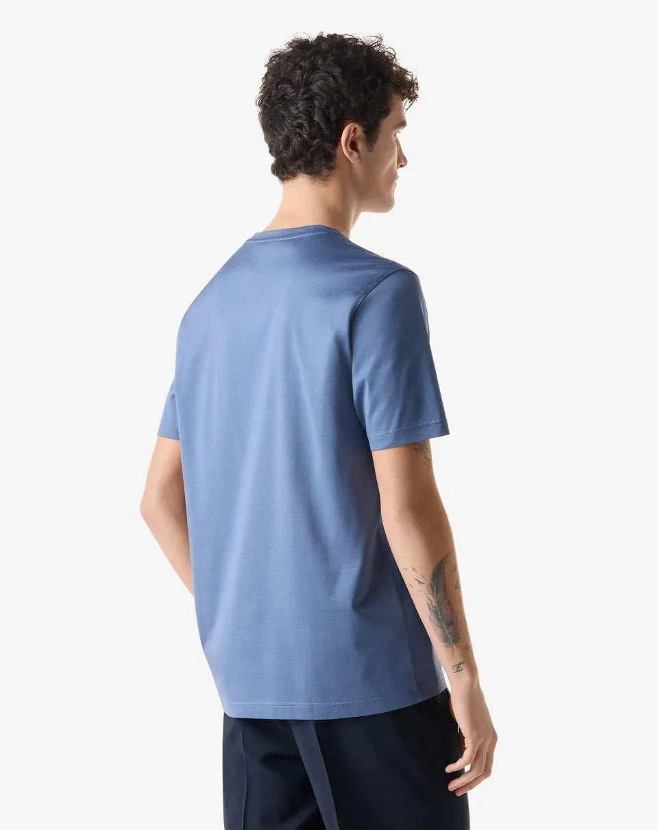 Made in Italy from shiny plain knit lisle, this pure cotton crew-neck T-shirt is a men's wardrobe essential. The short-sleeved construction and clean design enhance its versatile attitude, while the Corneliani crest on the side adds a distinctive and discreet detail.