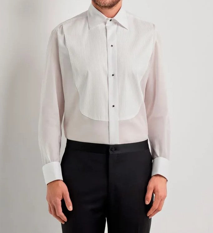 Our white cotton dress shirt is a stunning choice for your formal engagements. Realized in a pure cotton material, the garment has a pleated bib and Italian collar. Black stud buttons serve as a distinguished detail, marking the wearer as a man of great taste.