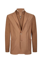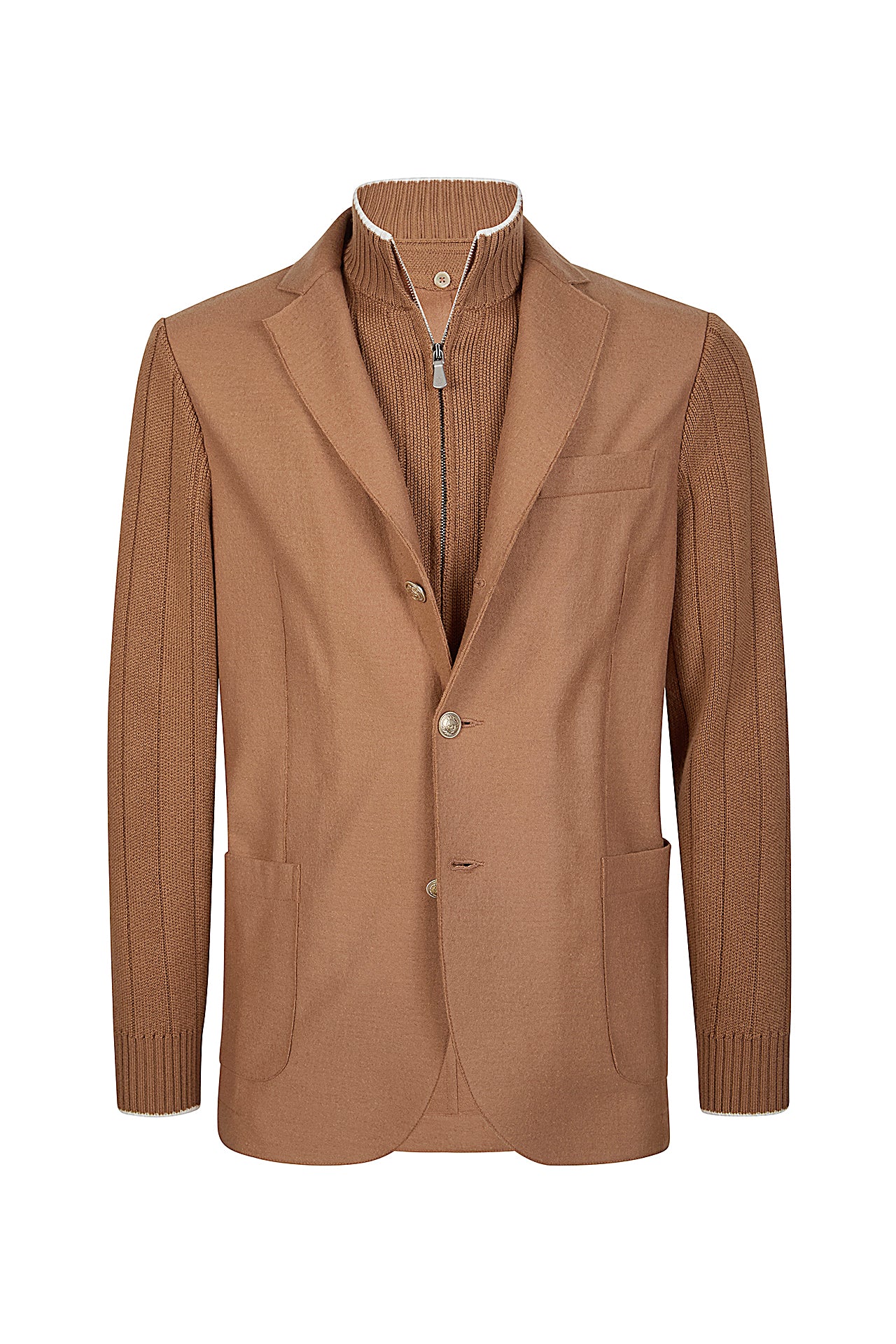 Man JACKET WITH BIB - Single-breasted jacket in wool jersey. Detachable full-zip inner front bib for a sporty vibe, complete with a hood. Sleeves in braided jersey. The jersey's stretchiness ensures a comfortable fit for any body type, while still preserving its tailored appearance, regardless of size or shape.