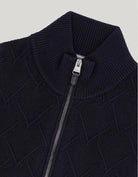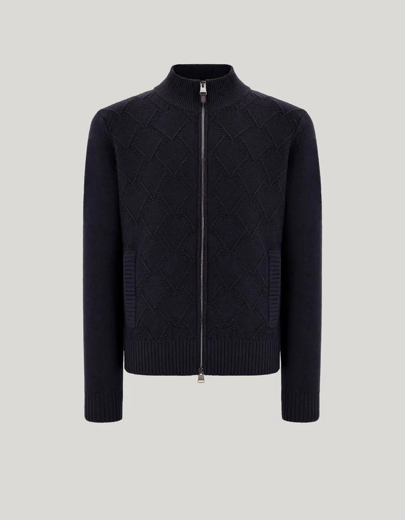 Double-slider full zipper cardigan in garment-dyed extra-fine merino wool, an emblem of dynamic elegance and contemporary understatement. The diamond macro-structure on the front harmonizes with the clean plain knit sleeves and back, creating a sophisticated balance between character and sophistication. A versatile and comfortable piece, perfect for interpreting every moment with natural elegance.