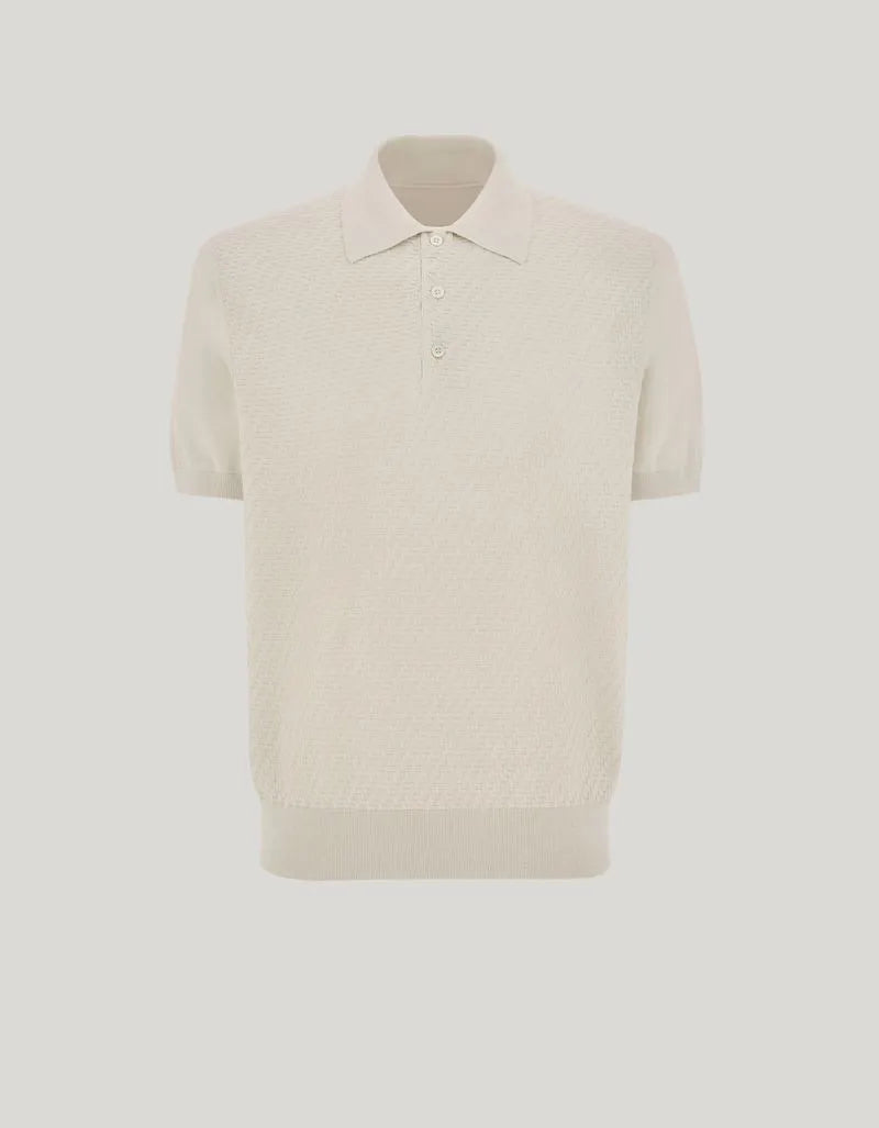 Short-sleeved polo shirt in a cotton-silk blend with a refined microstructure that lends depth and character to the fabric. The ribbed trim on the collar, sleeve edges, and bottom hem adds balance to the design, for an essential garment that interprets the casual style of the contemporary man with natural elegance.
