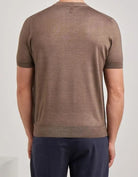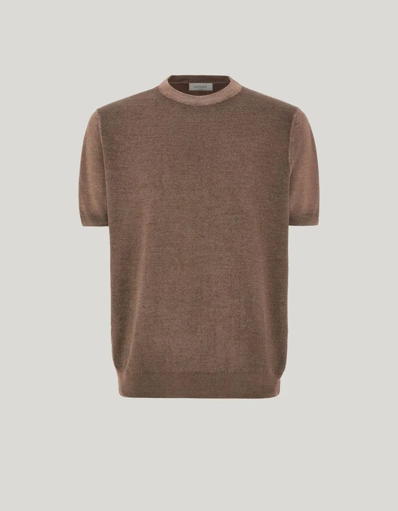 Short-sleeved wool and silk blend crew neck, featuring a micro-structure on the front and back, and plain sleeves. The special garment dyeing process enhances the natural texture of the yarn, making each piece unique. A versatile and comfortable piece, perfect for the casual and refined style of the dynamic man.