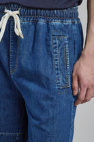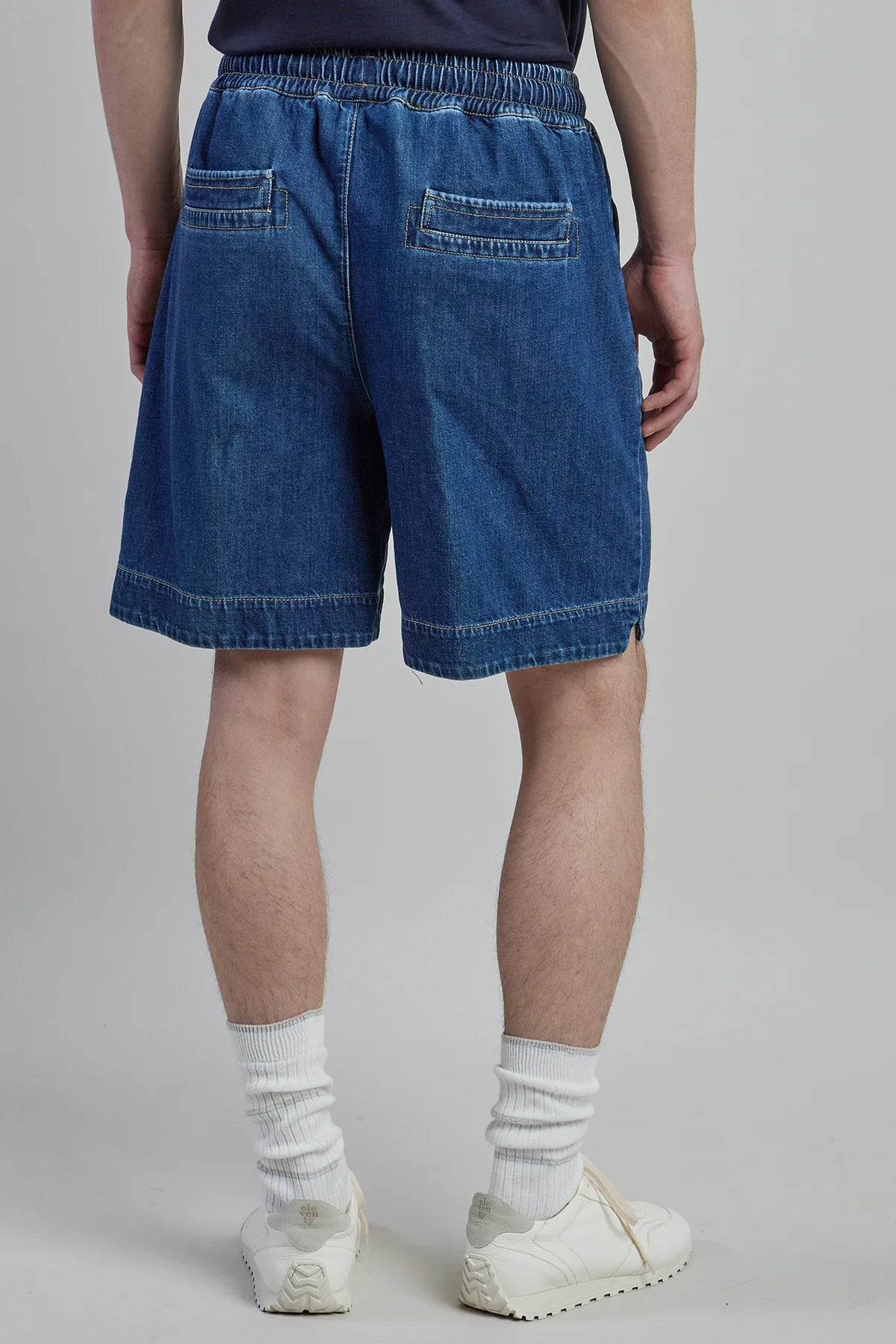 Bermuda joggers in garment-dyed cotton for a relaxed, looser fit. The dyeing process accentuates the color nuances along the seams, giving it a worn appearance. Piping detail on pockets and drawstring waist with Alcantara stoppers. Cut to sit just above the knee.