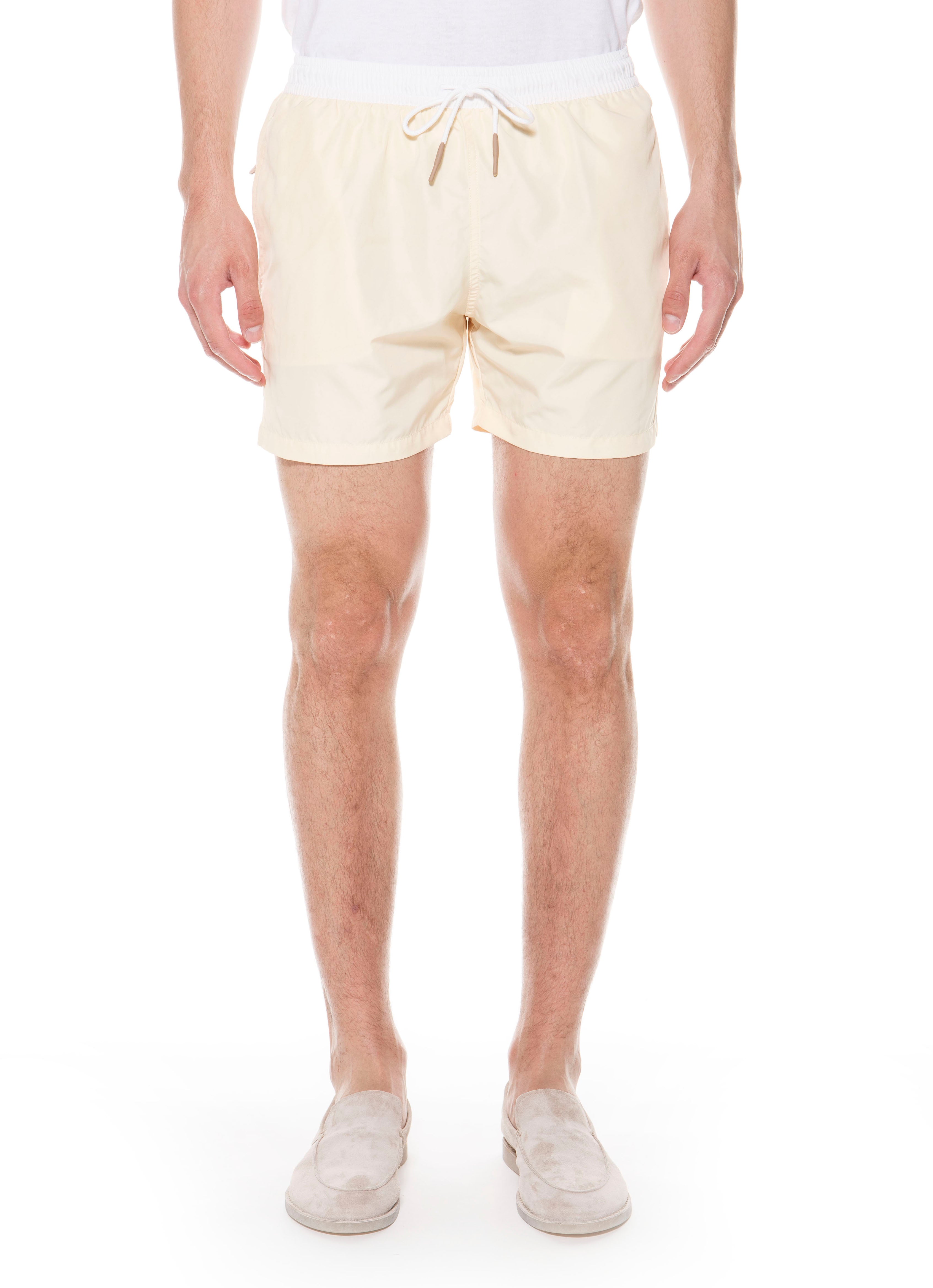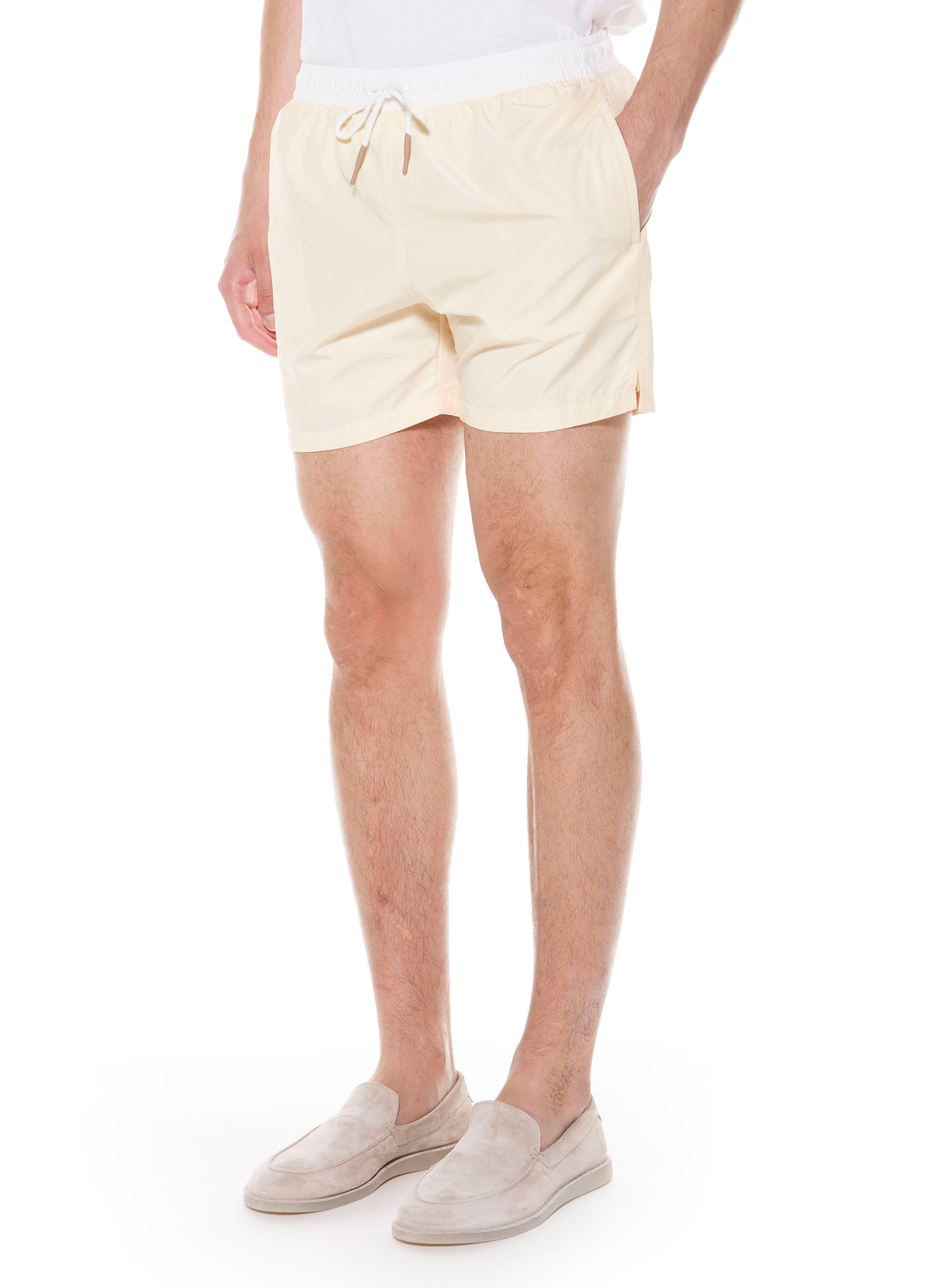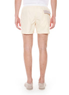 The color block beach shorts are made of a light nylon with a silky touch, which gives ease and comfort to the wearer. Regular fit and length above the knee characterize the product, embellished by the presence of a melange gray drawstring. The particular construction and the lightness of the fabric allow the swimsuit to be closed inside the back pocket. The details of the horizontal bands on the left bottom of the boxer give it a sporty look.