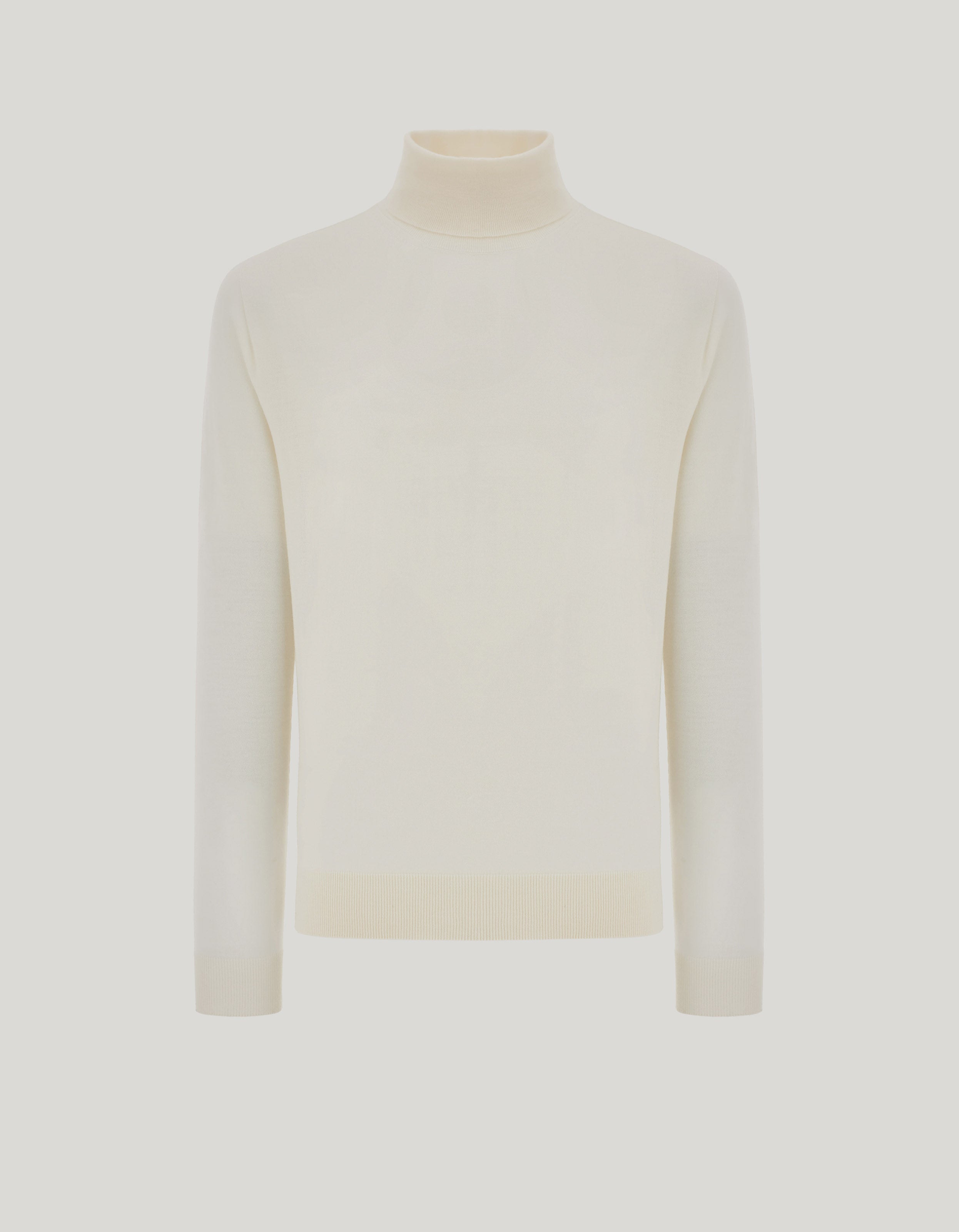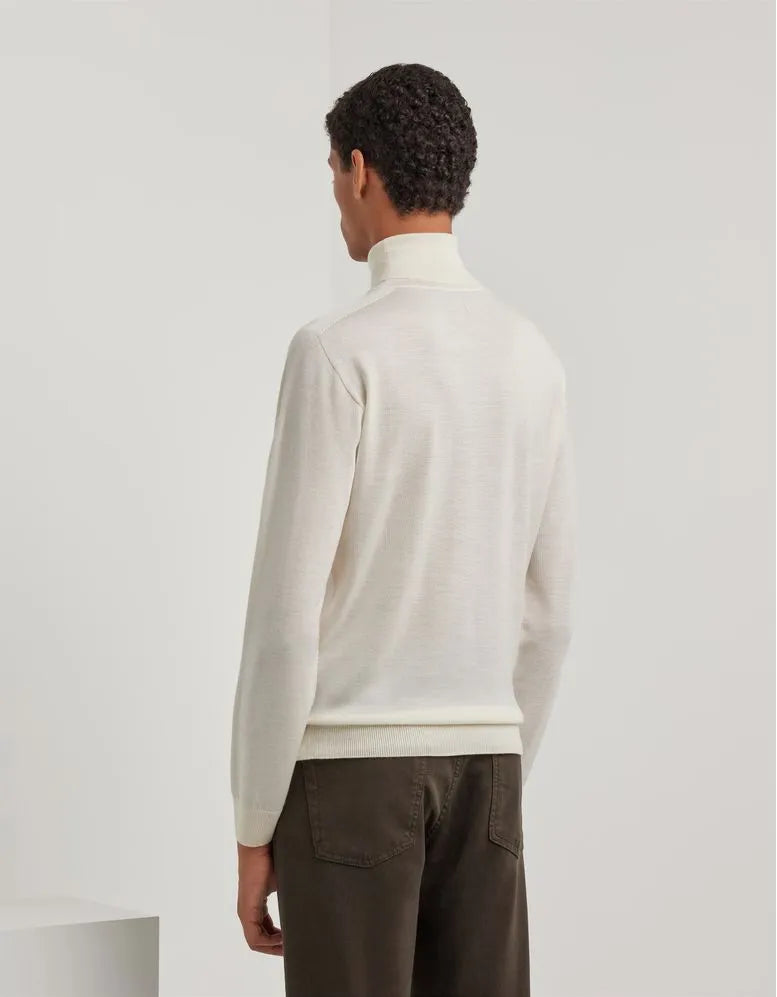 Seamless turtleneck in precious extra-fine merino wool, an expression of essential and sophisticated style. The seamless construction wraps the silhouette lightly and naturally, while the smooth finish and tag on the back add details of refined discretion. A distinctive and versatile piece designed for those who wish to approach every occasion with contemporary elegance and unparalleled comfort.