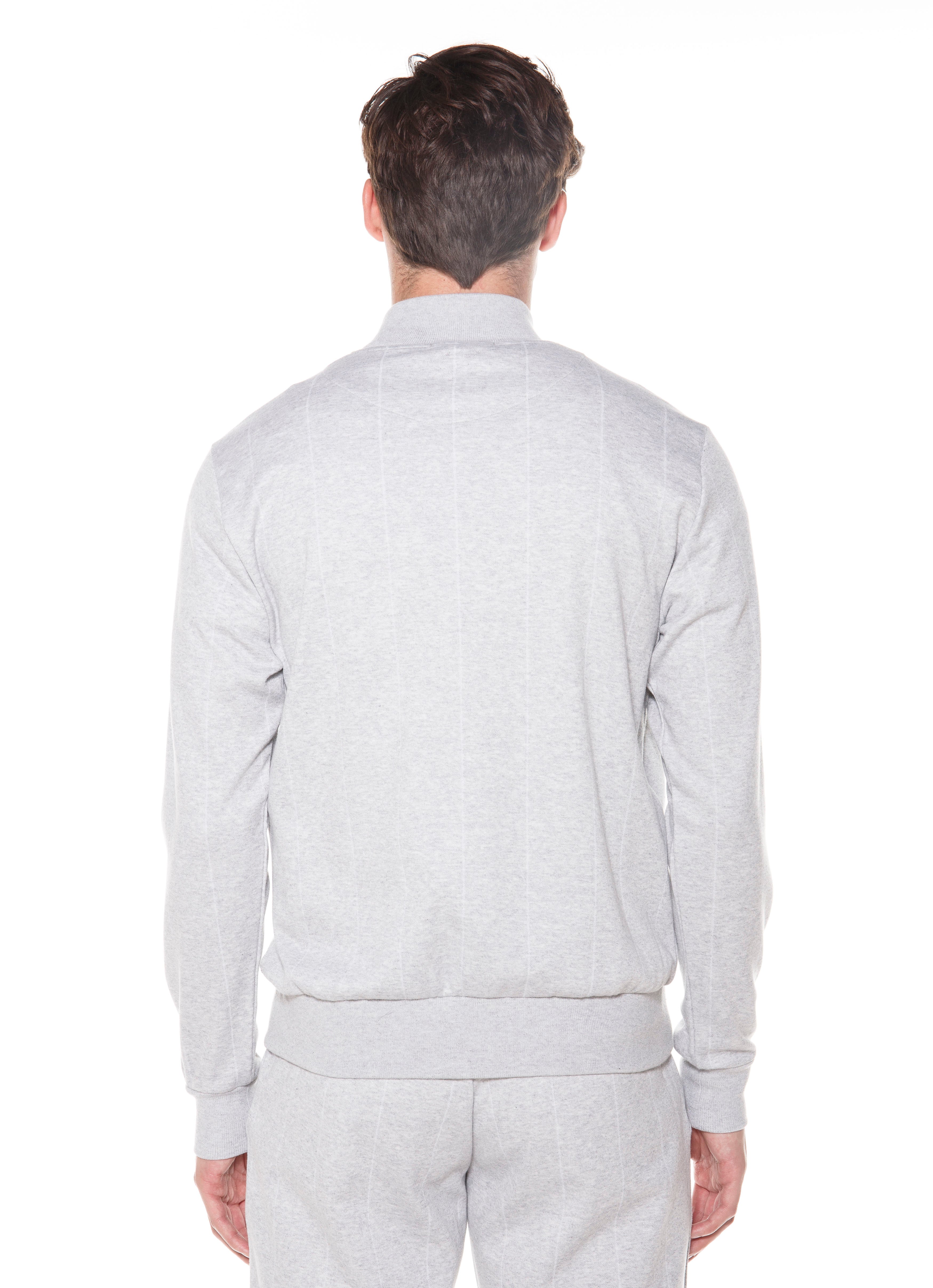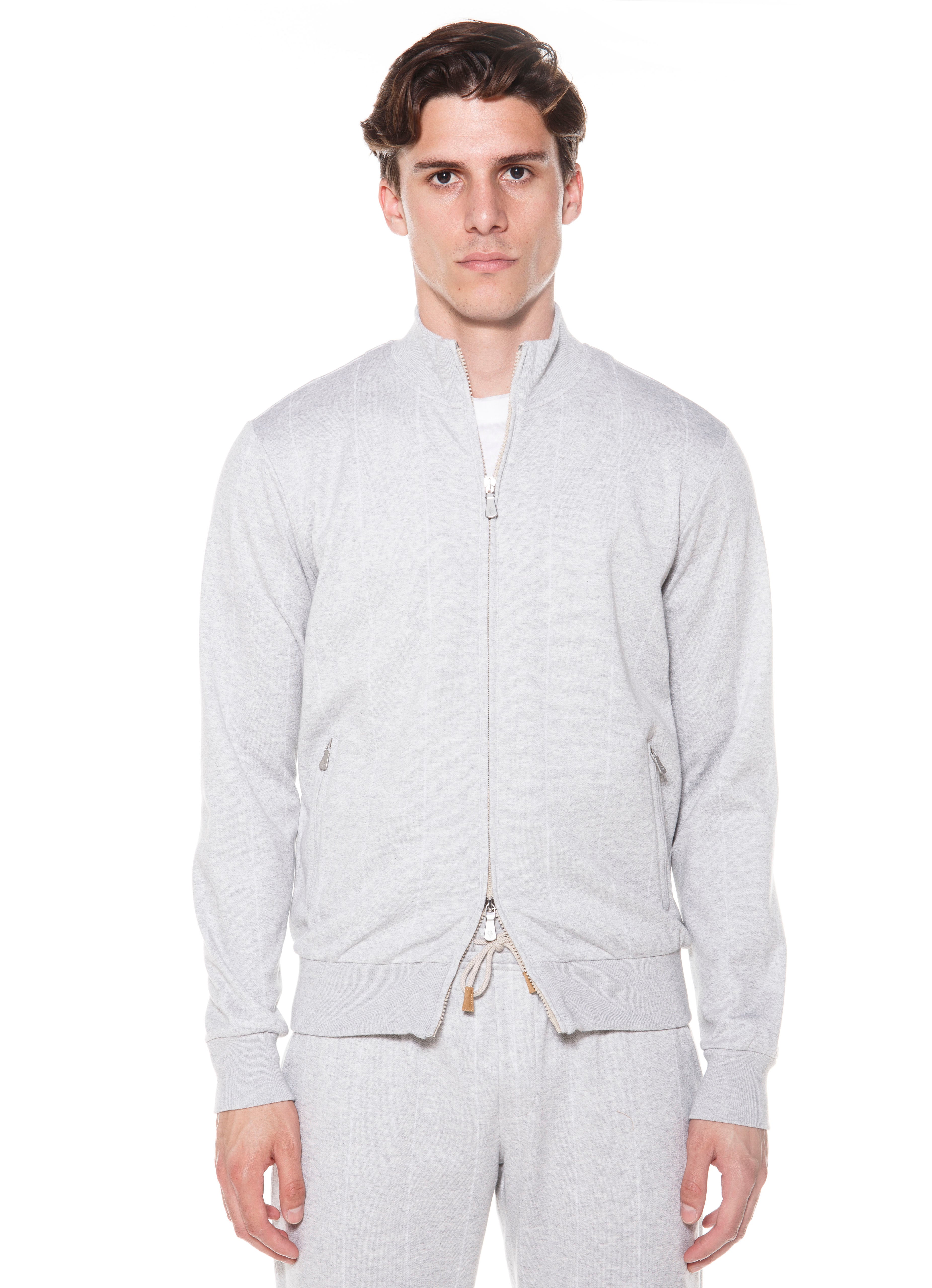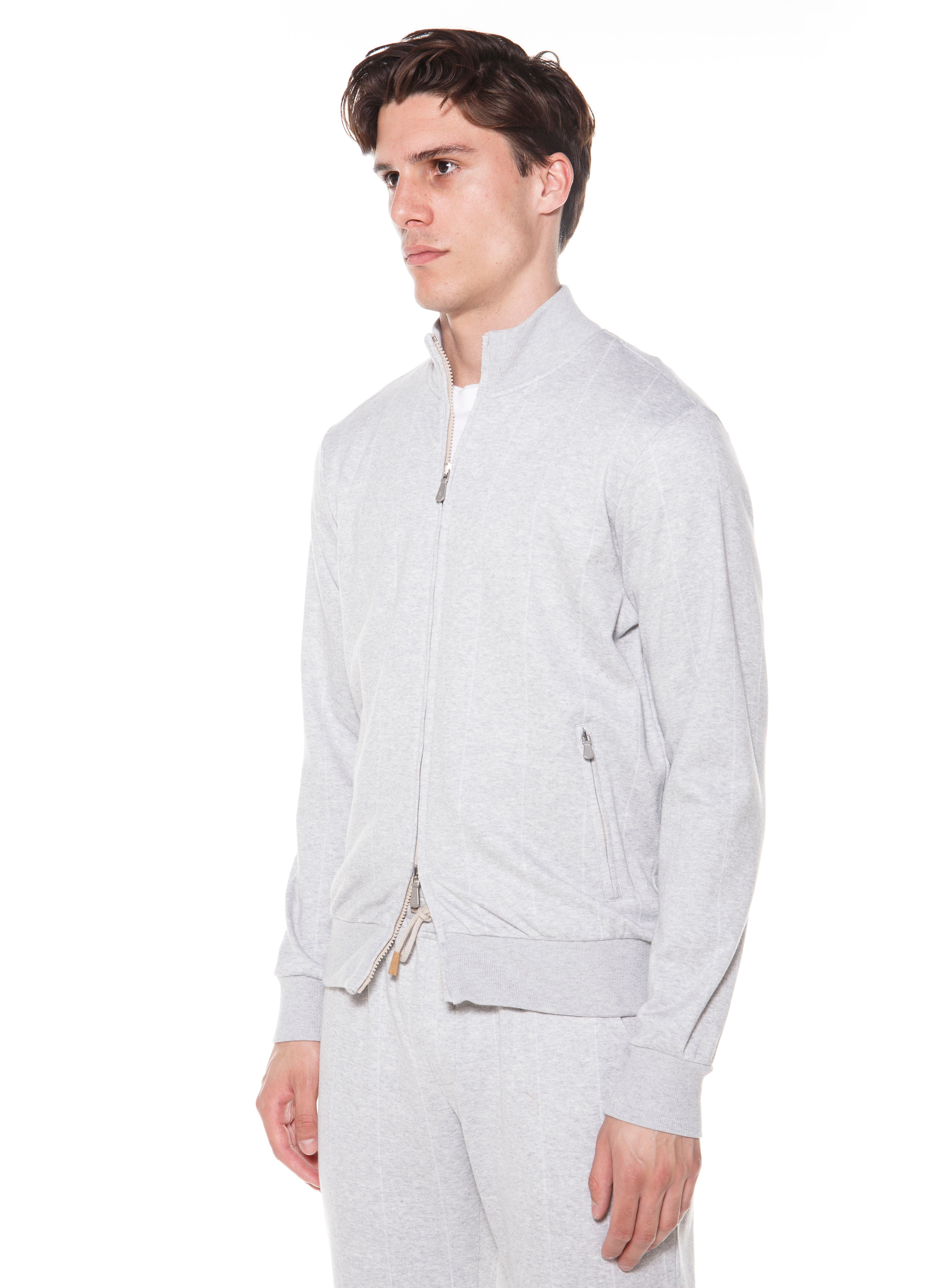 This full zip sweat bomber is proposed in striped cotton. Thanks to the delicate pinstripe pattern the style shows a modern twist and a sophiticated allure. The rib collar varstiry style makes it a casual garment.The cast-dye zipper with branded accessories complete the look.