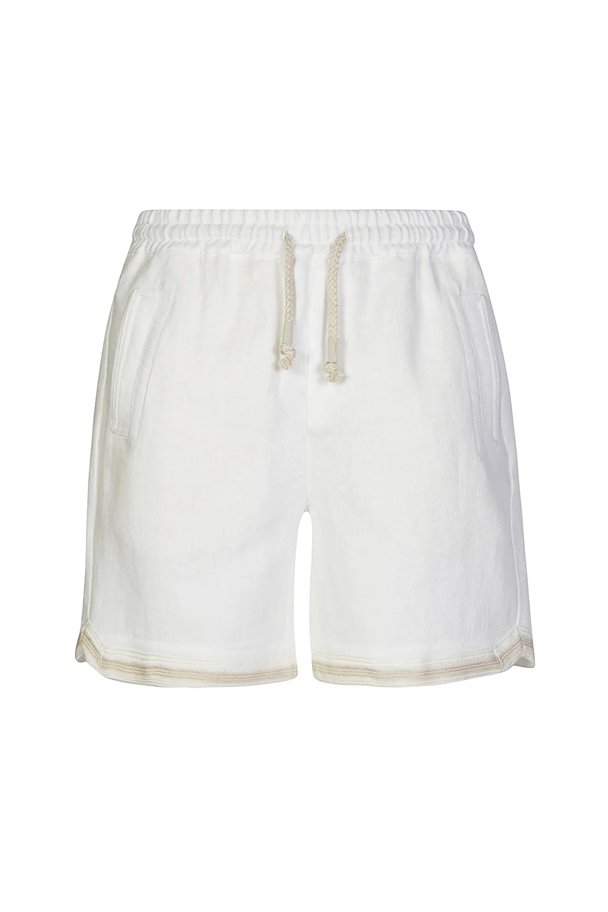 Bermuda shorts in linen for a relaxed, looser fit. Rope drawstring waist and Alcantara details. The garment is embellished with trimmings sewn onto the bottom.